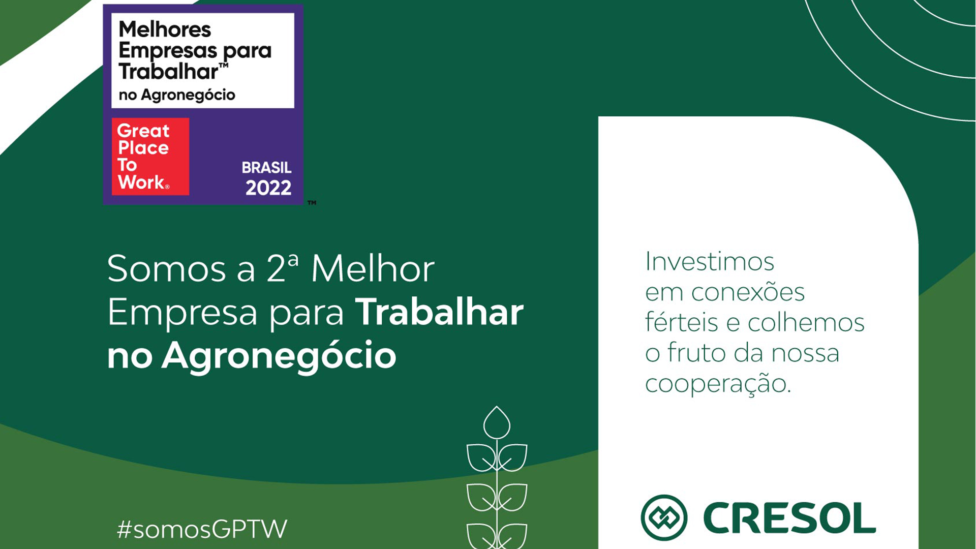 A Cresol é eleita, pelo terceiro ano consecutivo, uma das melhores empresas para trabalhar no agronegócio, por meio do ranking do GPTW (Great Place to Work). Conquistou, nesta edição, a segunda posição na categoria empresas de grande porte.