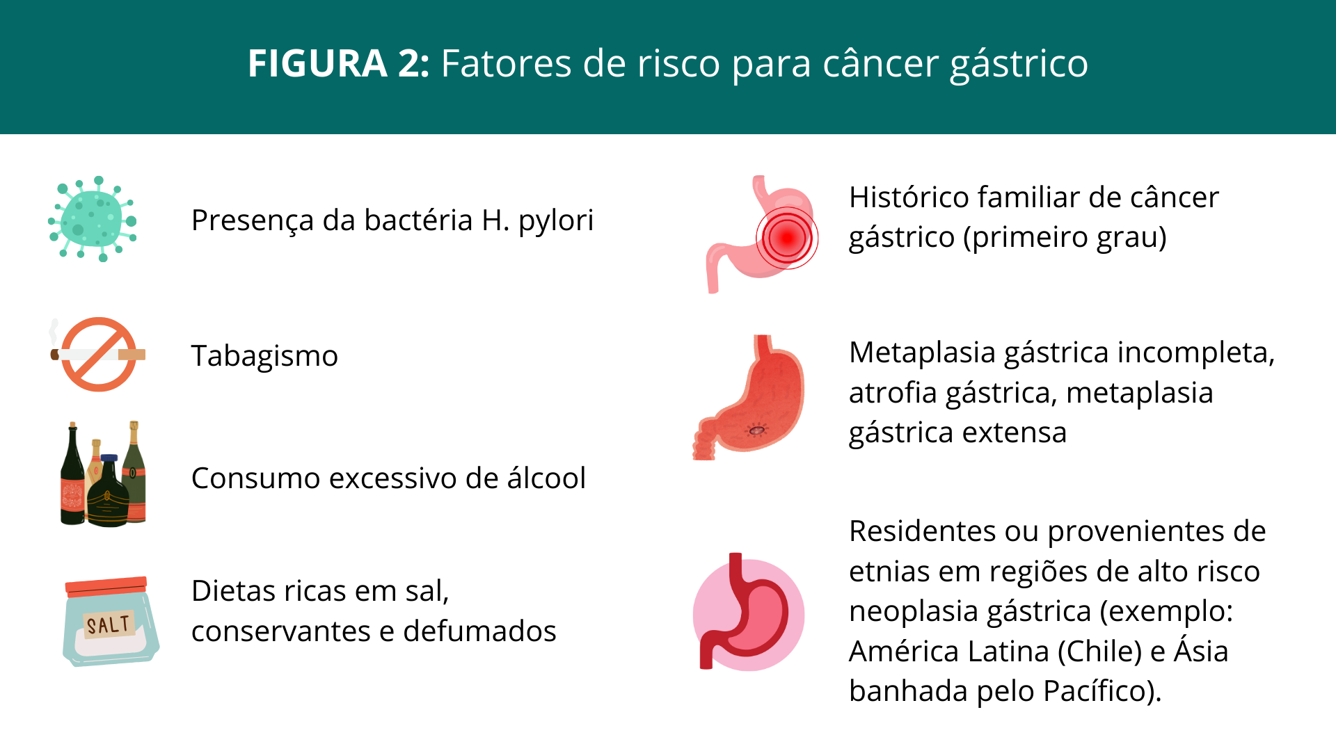 O aparecimento de câncer gástrico a partir da metaplasia é influenciado pela presença de fatores de risco. Os fatores de risco controláveis são aqueles em que podemos atuar, como a presença da bactéria H. pylori, tabagismo e dietas ricas em sal, conservantes e defumados. Os fatores de risco não controláveis são metaplasia gástrica incompleta, atrofia gástrica, metaplasia gástrica extensa, histórico familiar de câncer gástrico e residentes ou etnias em regiões de alto risco neoplasia gástrica (exemplo: América Latina (Chile) e Ásia banhada pelo Pacífico).
