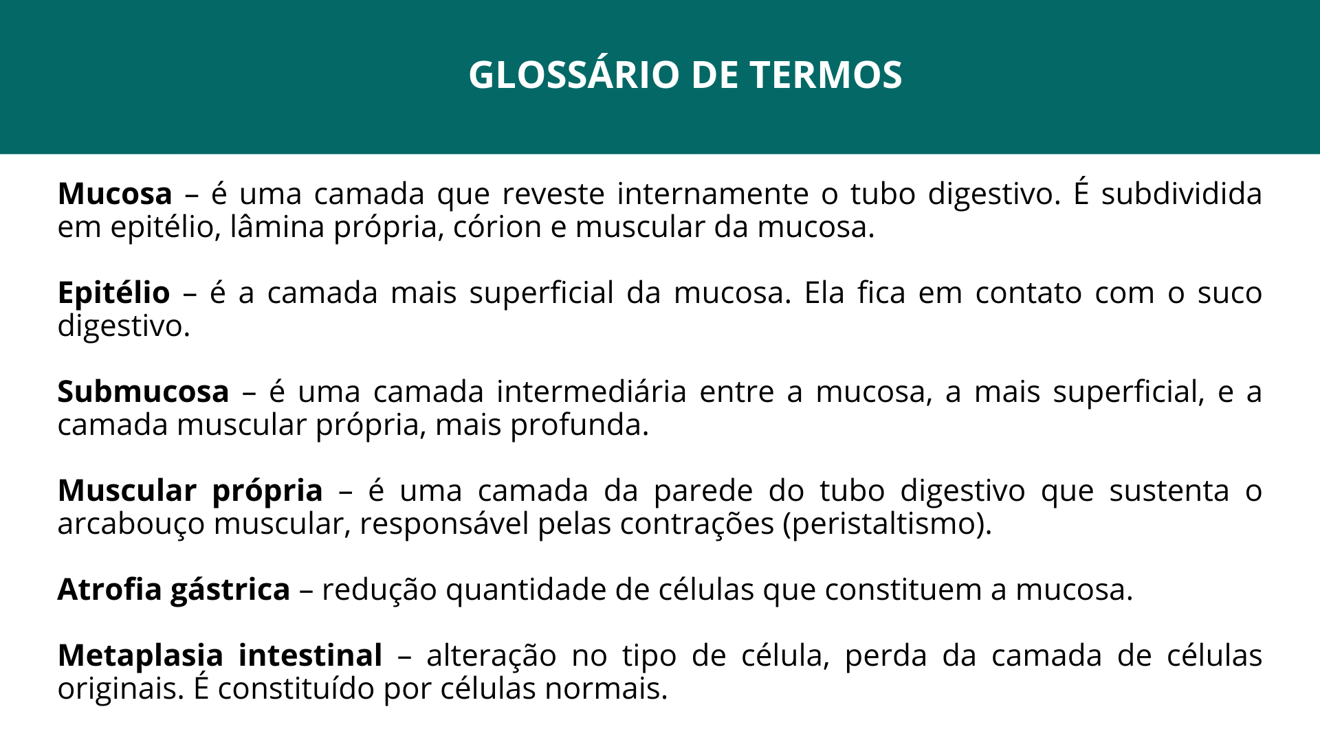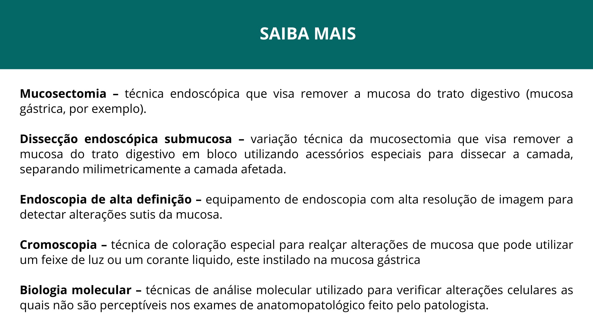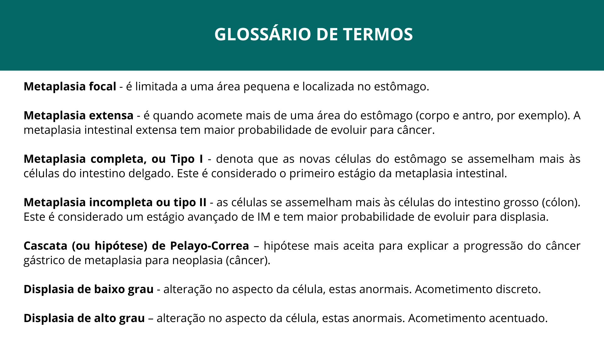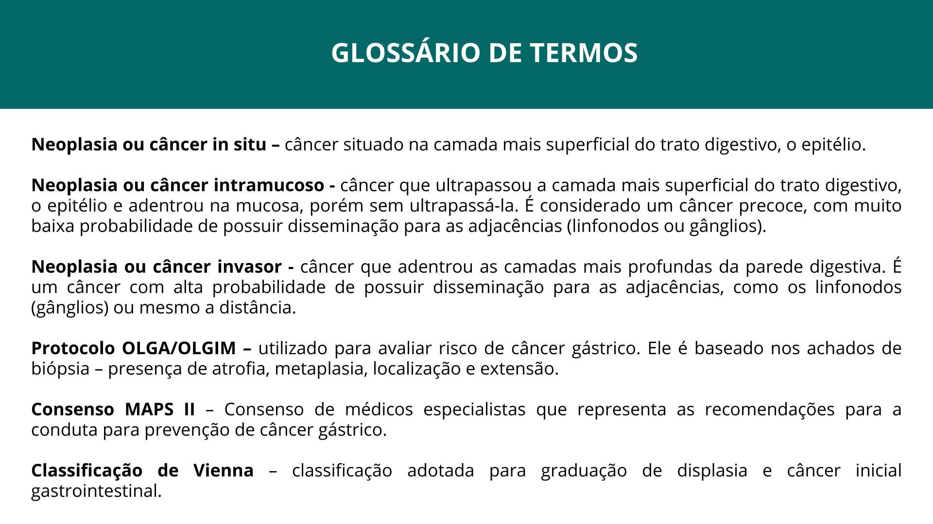 PALAVRAS-CHAVE: displasia, metaplasia, câncer in situ, endoscopia, estômago, atrofia, gastrite crônica, pré-maligno, câncer, diagnóstico, tratamento.