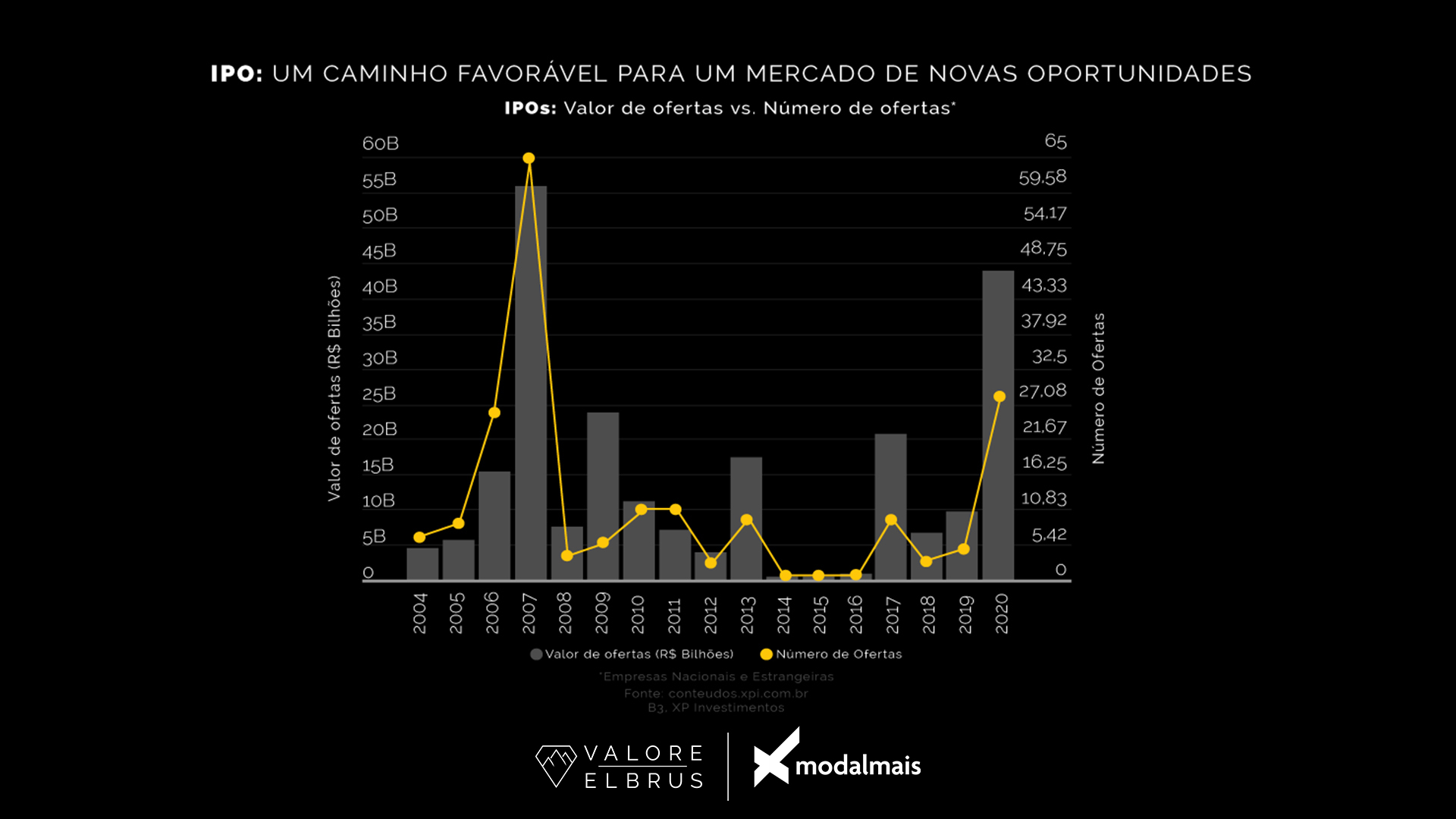 O Brasil teve, em 2020, o maior número de IPOs na bolsa de valores brasileira, a B3, desde 2007. Foram 31 empresas oferecendo publicamente suas ações pela primeira vez, movimentando mais de R$ 30 bilhões. Em 2021, a tendência é de que o movimento continue. Já existem 34 companhias aguardando a autorização da Comissão de Valores Mobiliários, a CVM, para realizarem seus IPOs, e levantamentos do mercado mostram a expectativa de aproximadamente 100 IPOs até o fim do ano.
