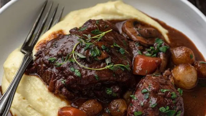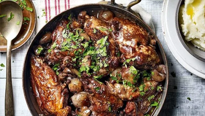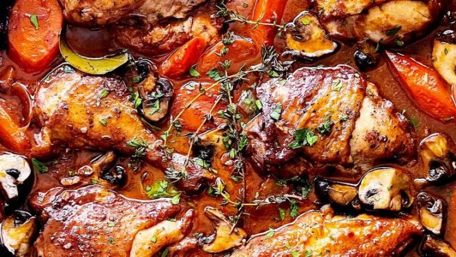 O Coq au Vin é conhecido por sua combinação de sabores intensos e profundamente aconchegantes. É preparado com pedaços de frango, geralmente galo, cozidos lentamente em vinho tinto, frequentemente complementado por cogumelos, cebolas, bacon e ervas aromáticas. Os chefs preparam este prato até a carne ser cozida e ficar macia. O objetivo desta técnica é que a carne absorva os sabores complexos do vinho e dos ingredientes aromáticos.