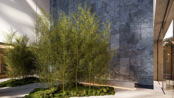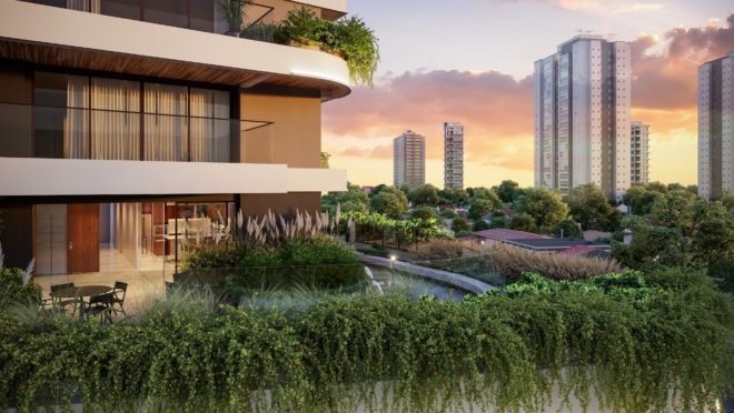 Jardins e espaços verdes: o empreendimento incentiva a conexão com a natureza por meio do projeto paisagístico, assinado por Rodrigo Oliveira, que faz uso de floreiras com árvores nas sacadas e nas áreas comuns, além de jardins verticais. Destaca-se a paisagem criada para o espaço da lareira externa.