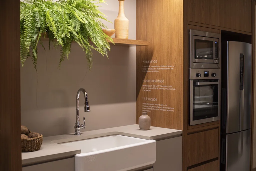 Kohler acabamentos: Os acabamentos atemporais de cromo polido, níquel escovado, ouro rosa vibrante e preto fosco para torneiras de cozinha e banheiro da Kohler adicionam elegância e oferecem uma aparência coesa ao espaço.
