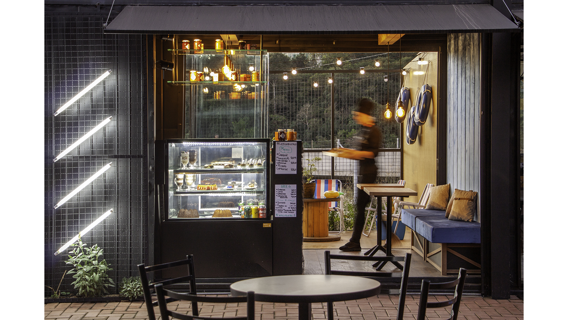 Cada metro quadrado do local é repleto de itens que atraem o olhar. Os profissionais da Melão Arquitetos explicam que o objetivo é estimular o consumo dentro do bistrô e a permanência no local. Além disso, segue o conceito de espaços “instagramáveis” — isto é, que rendem belas fotos para publicação nas redes sociais. Um exemplo é a área da floresta com a cadeira de balanço. Em resumo, a cenografia transforma o pequeno contêiner num aconchegante bistrô, com texturas e cores únicas.