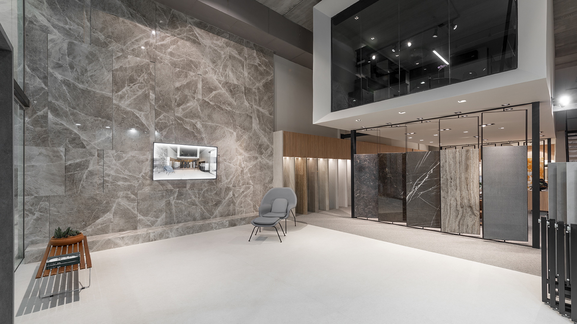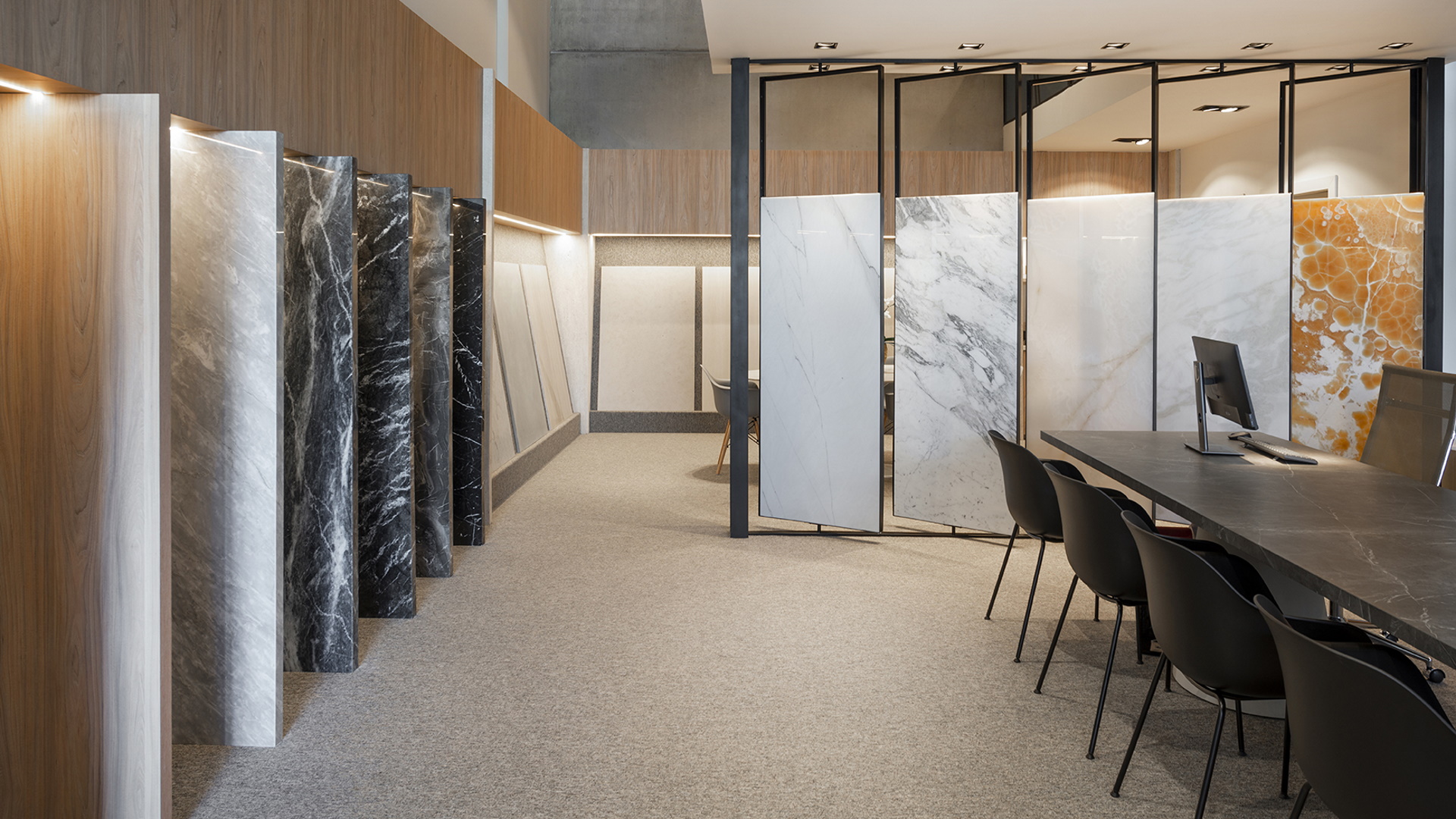 O showroom é coroado por um grande painel que chama a atenção pelos formatos surpreendentes das placas de ultracompactos italianos. Com uma altura generosa, o monumento sobre trilhos impacta o olhar dos visitantes. Aqui, inovação e tecnologia para ambientes que exigem um cuidado especial, afinal o sinônimo desse material é resistência a manchas.
