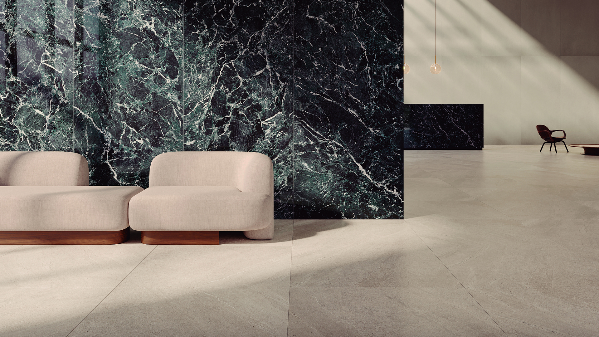 Folk é fusão ritmada que faz surgir uma superfície surpreendente, atemporal. As lastras têm tons neutros e pequenos agregados fossilizados. Agora também em formato 90x90 e 120x120 nat e ext, ou seja, in and out.