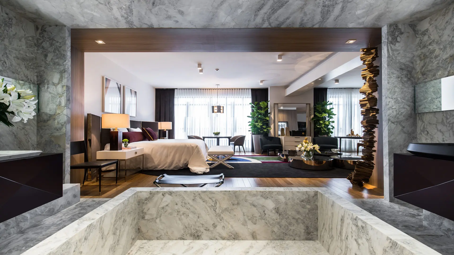 Houve um tempo em que o mármore não era recomendado para áreas com muito movimento, fricção e umidade, mas isso é passado! Hoje, basta o uso de bons impermeabilizantes para proteger o material. Isso permite, por exemplo, que o mármore seja utilizado em qualquer ambiente, incluindo áreas molhadas, como cozinhas, banheiros e também áreas externas. A impermeabilização é fundamental, pois garante maior resistência a riscos, corrosões e absorção de líquidos.