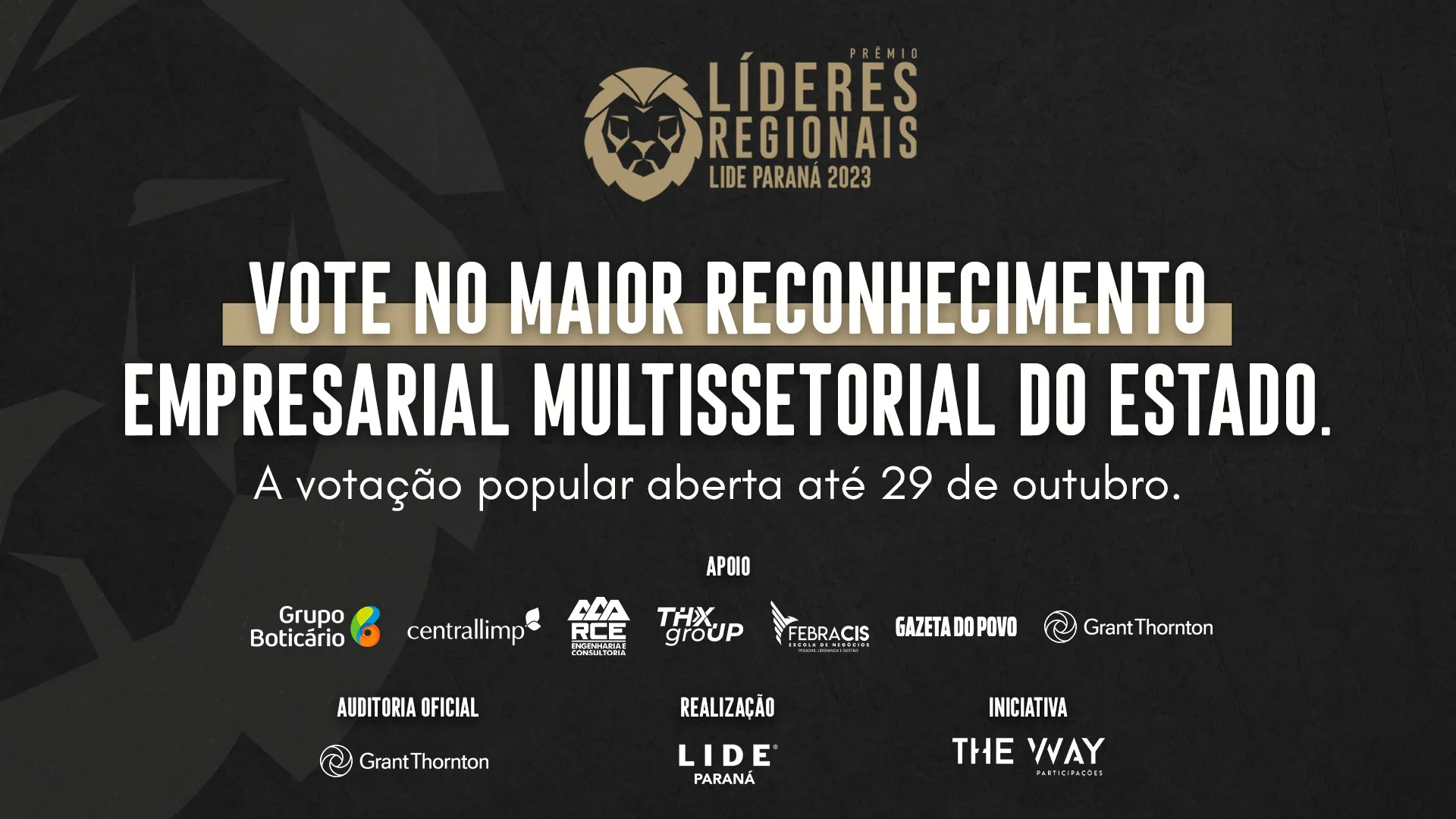 A população do Paraná já pode escolher as melhores empresas e empresários do Estado para receber o Prêmio Líderes do Paraná – 2023. A fase de votação popular está aberta e se encerra no próximo dia 29 de outubro. Para votar, basta acessar o link da votação no site do LIDE Paraná. Só é aceito um voto por CPF. O prêmio é uma iniciativa do LIDE Paraná e tem como objetivo reconhecer e prestigiar as empresas e empreendedores que fomentam a economia do Estado.