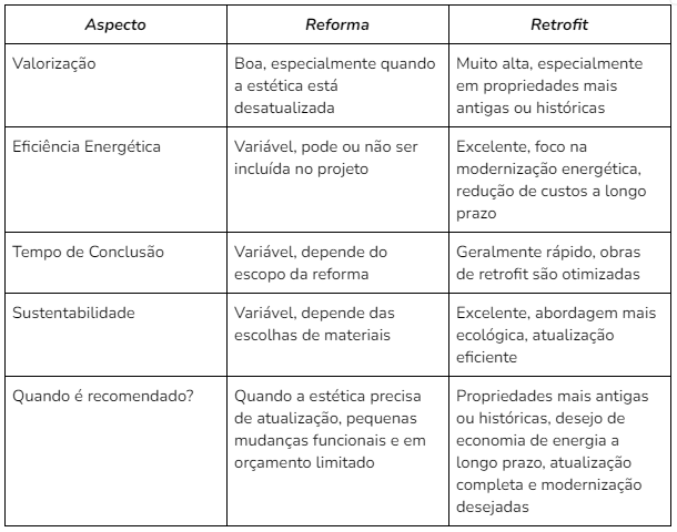 Como mostramos na tabela acima, o retrofit se destaca ao proporcionar maior valorização financeira do imóvel, pois traz eficiência energética e compromisso com a sustentabilidade que podem ser atrativos para novos compradores. Por ser uma tendência europeia, esta técnica também se consolida como um diferencial atrativo.