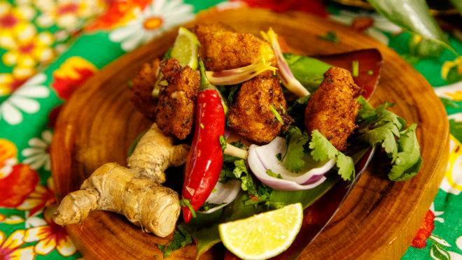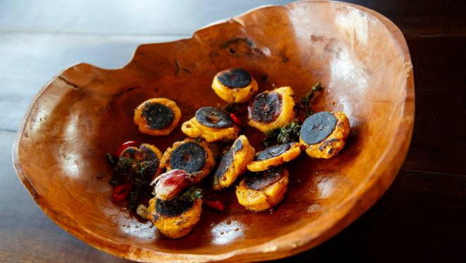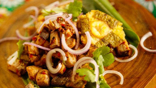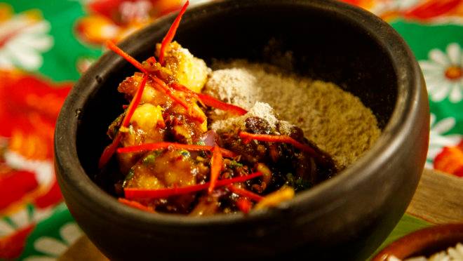 Entrada: Dadinho de aipim com geleia de maná-cubiu e pimenta. Prato principal: Curry verde de banana da terra, pupunha, tubérculos da região e farofa de chips de banana crocante.