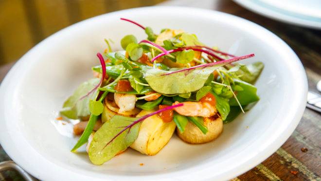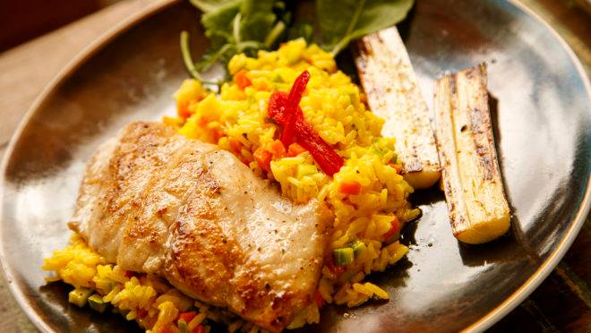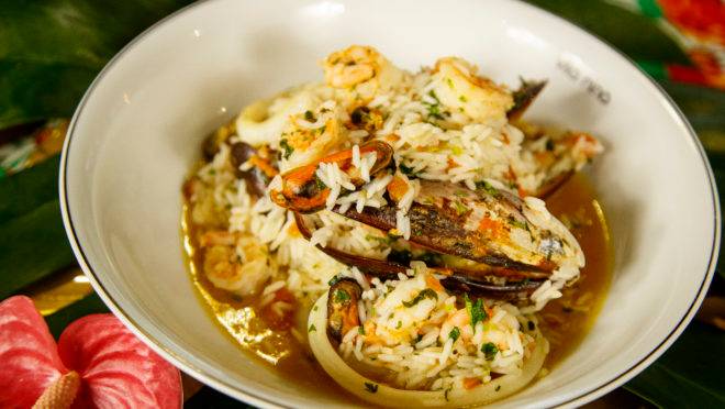 Entrada: Barreadinho de Canoa – Barreado de pescado do dia sobre tostones de banana da terra. Prato principal: Shaolin do Porto de Cima – Camarões salteados com gengibre e molho agridoce picante de maná-cubiu.