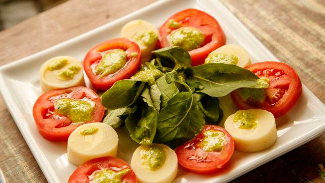 Entrada: bolinho de mandioca recheado com barreado. Prato principal: nhoque de banana da terra com tomate fresco, palmito pupunha e gengibre.