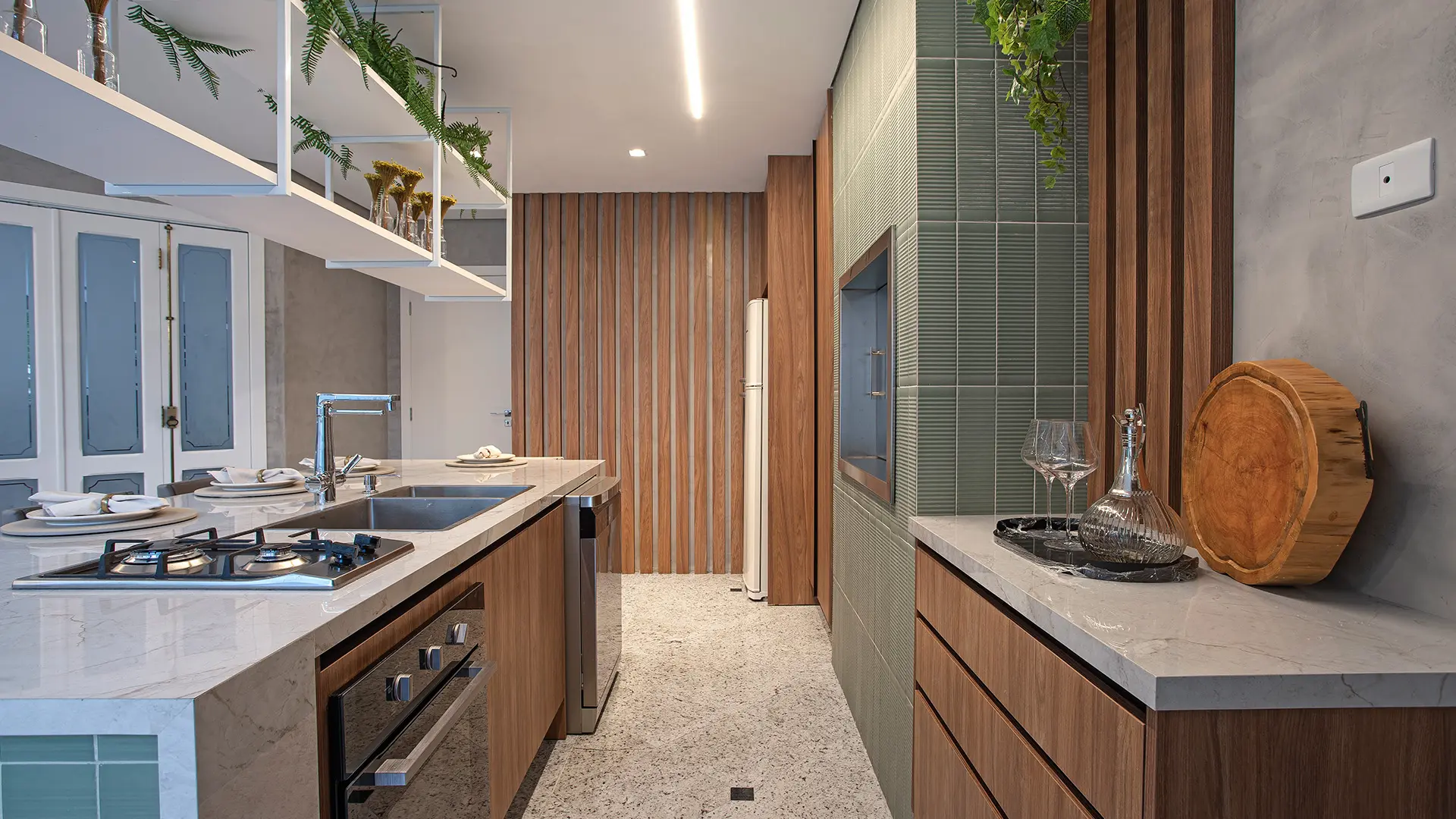 - Facilidade de Manutenção: “escolho materiais que sejam fáceis de limpar e manter, ajudando a preservar a aparência sofisticada do espaço. Superfícies lisas e resistentes a manchas, como azulejos de porcelana, pedras impermeabilizadas, madeira com resina ou sintética (industrializadas) e vidros temperados, são exemplos de acabamentos que requerem menos manutenção”, diz Carolina.