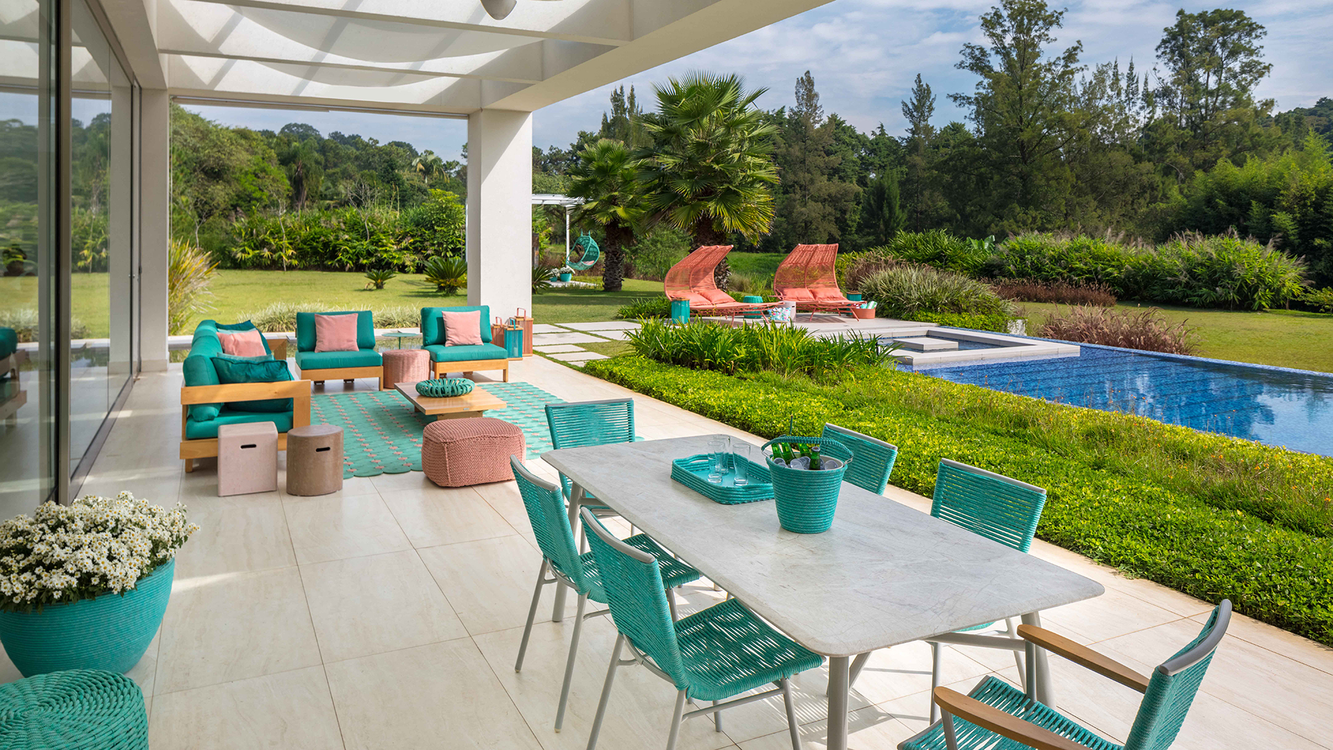 Em apartamentos amplos e com pé direito duplo, as varandas integradas à sala se tornam verdadeiras protagonistas na rotina da família. Elas estimulam a convivência e permitem receber amigos com mais conforto.