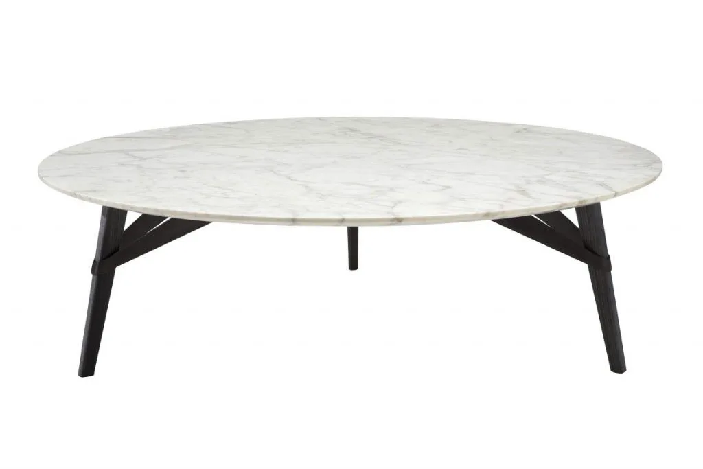 Essa é uma mesa de centro com a base em madeira e o tampo em mármore. Ideal para a decoração de uma sala minimalista. Possui dimensões de 120 centímetros de diâmetro e 35 centímetros de altura.