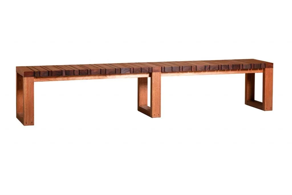 Esse banco é feito com ripas de madeira no modelo códigos de barras. Ele tem os pés robustos do mesmo material. Seu aspecto rústico contribui para o estilo minimalista, sem adereços, mas mantendo o alto padrão visual e material.