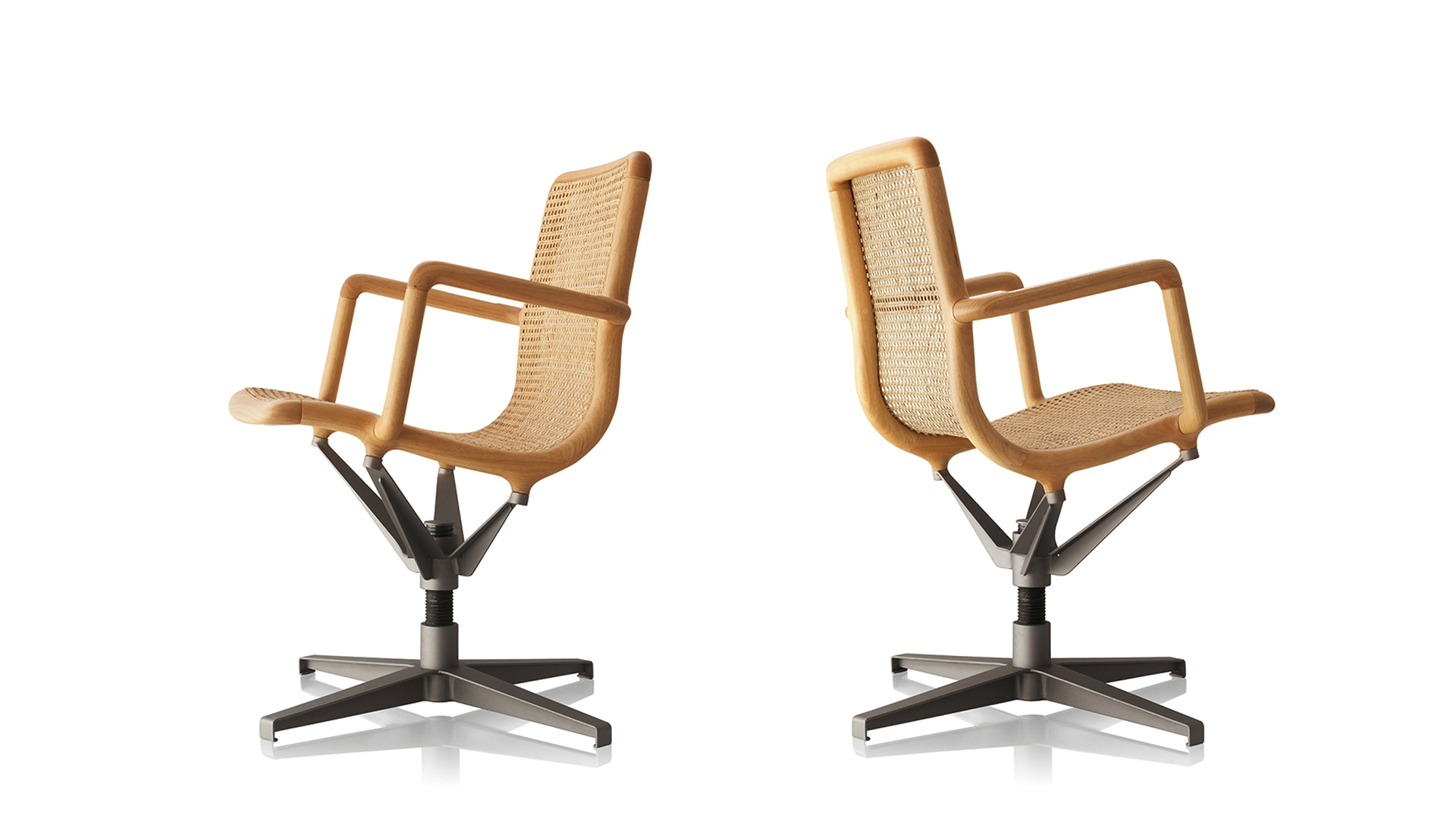 Esta peça, do designer Jader Almeida, é da linha Milla, que foi premiada com o IF Design Award em 2012. Ela combina a delicadeza do assento e encosto em palhinha, a solidez da madeira da estrutura e braços e a força da base em metal. As cadeiras giratórias são ideais para o home office porque permitem a movimentação sem maiores esforços. Ela mede 54 cm x 55 cm x 84 cm de altura.