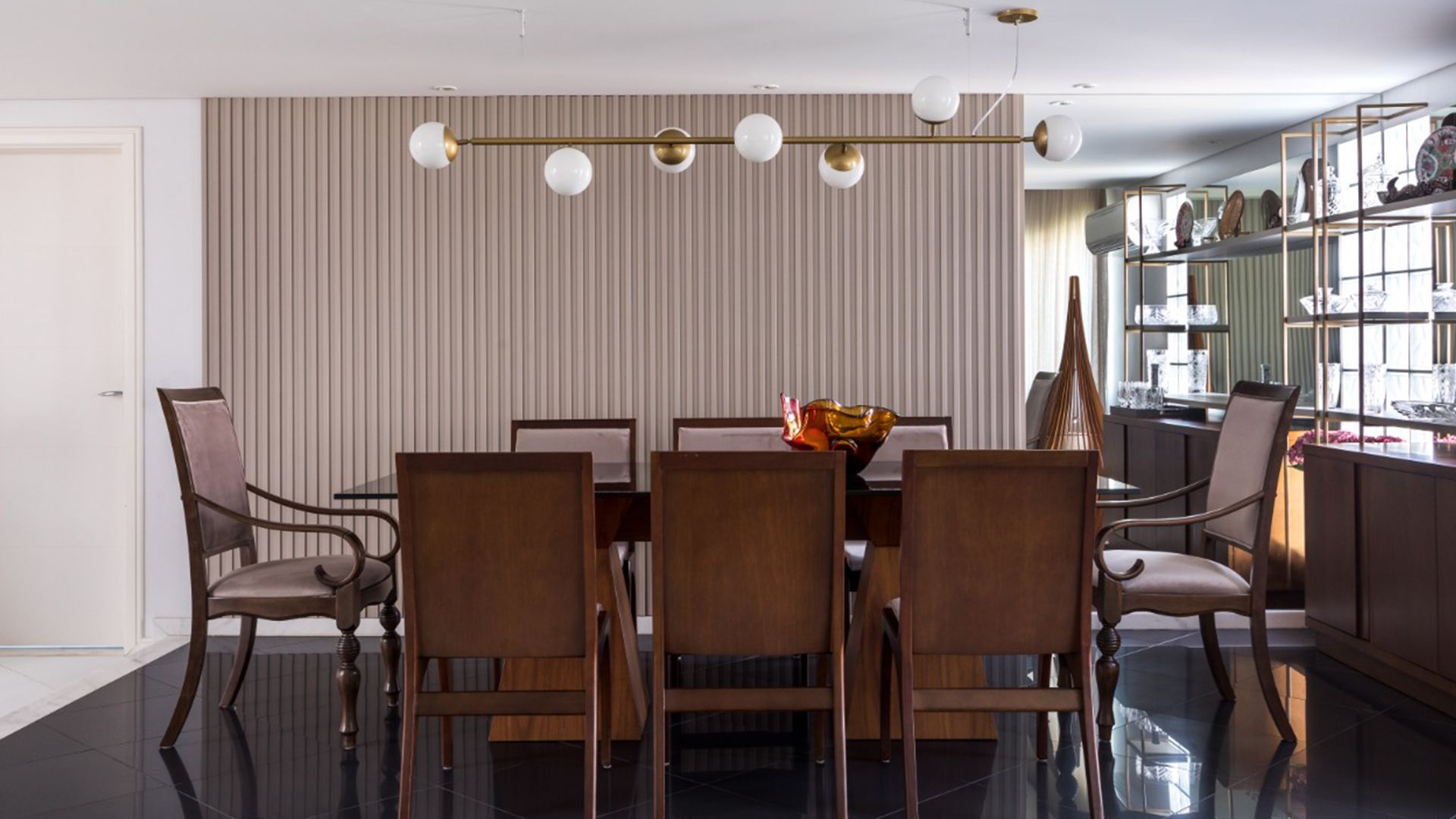 Os painéis ripados em marcenaria foram criados para integrar a Sala de Visitas com a Sala de Jantar. O resultado deu unidade ao ambiente.