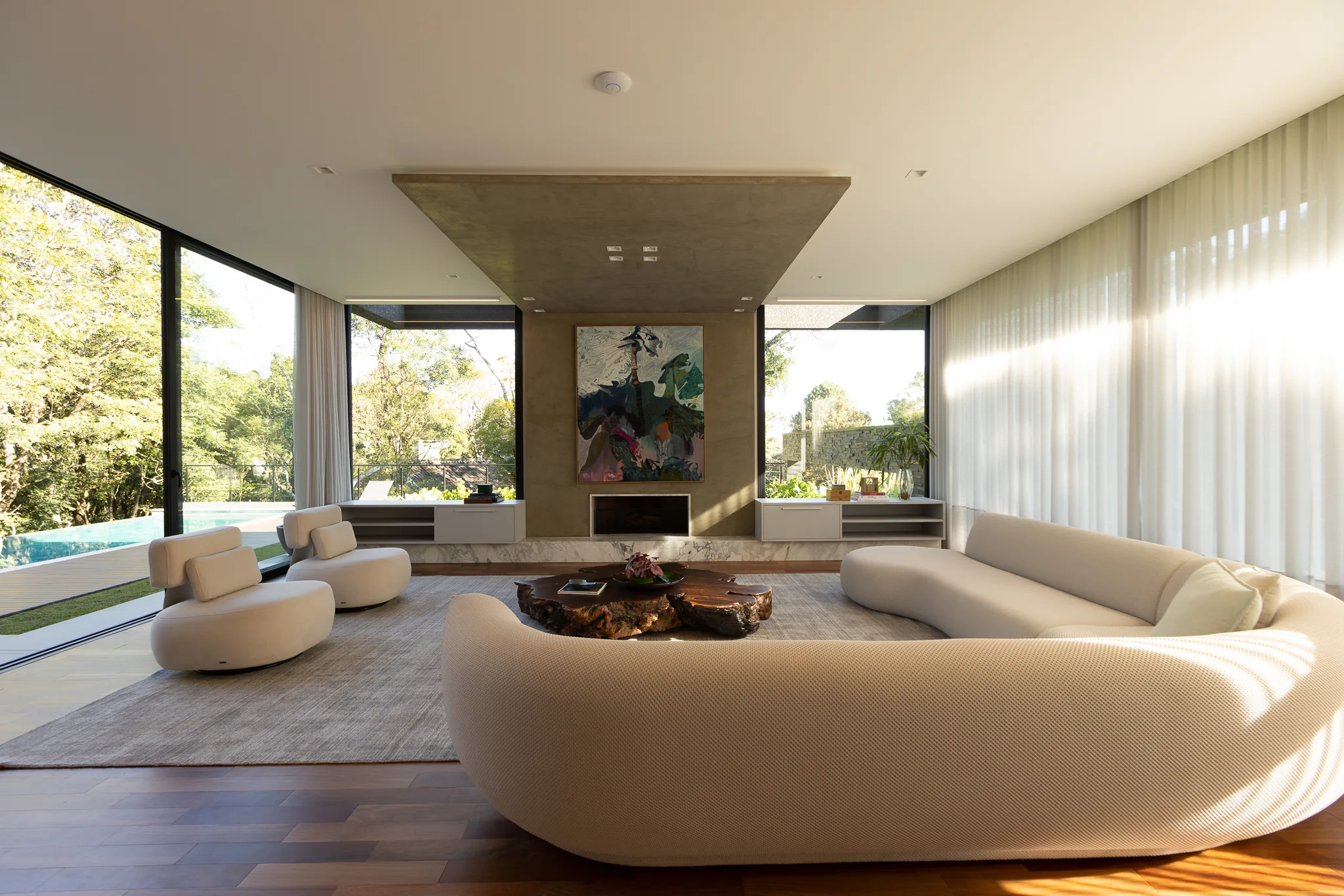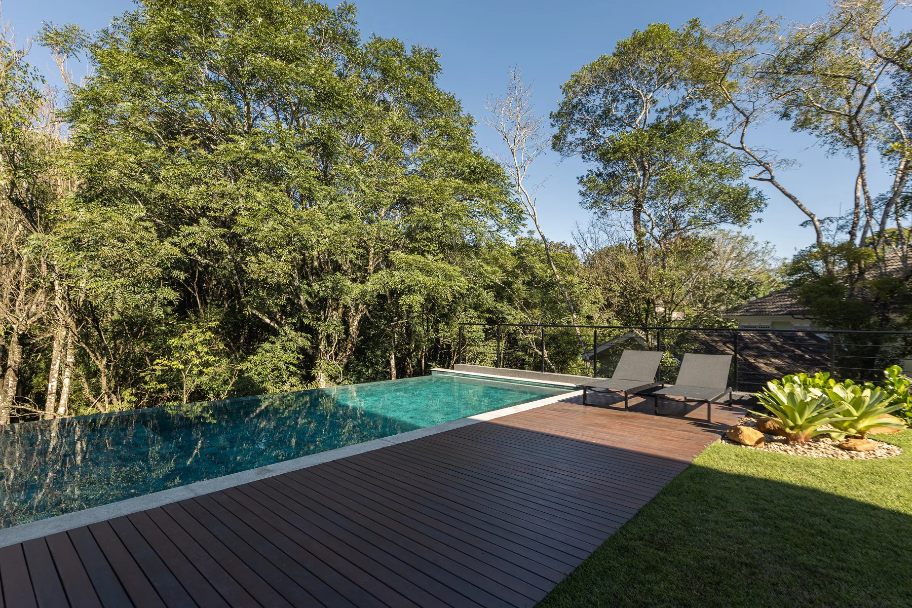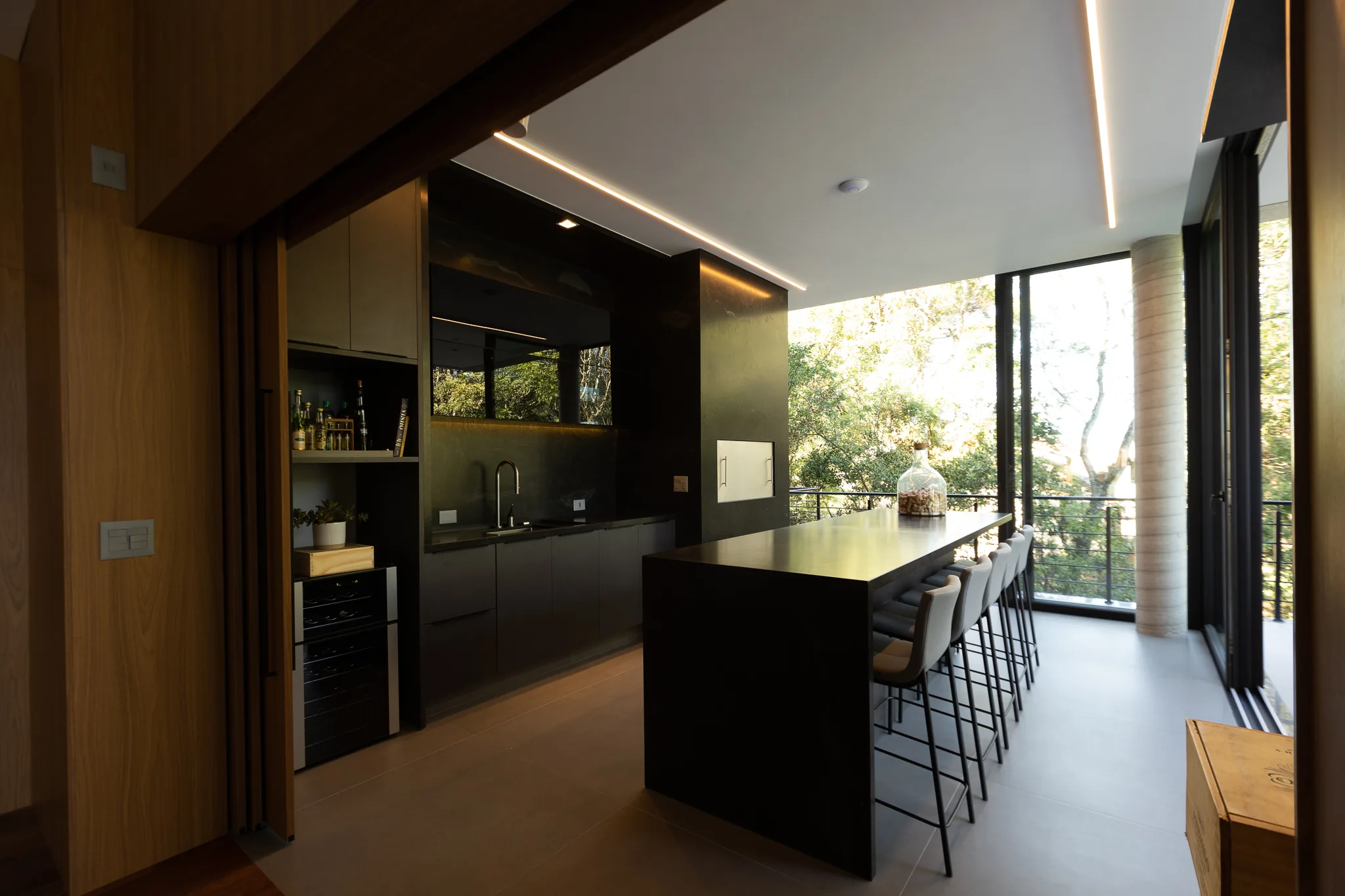 Segundo ele, no espaço gourmet há integração direta do bosque, com a varanda e com a piscina. “Fizemos uma quina de vidro, então não tem alvenaria no espaço gourmet, só temos um pilar redondo no canto do ambiente”, informa Sérgio. “Toda a parte de contorno externo é feita pelas esquadrias da Via Bianco, criando uma abertura de 100% e integração espacial”, complementa. Outro destaque do projeto é a varanda no térreo, em que a piscina é o que delimita a área plana do terreno. “Depois da piscina, já começa o bosque. Então, da piscina, por conta do declive, os moradores vêem a copa das árvores, o que criou um ambiente com um visual único”.