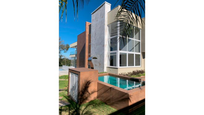 O espaço gourmet do projeto recebeu um canto envidraçado que abre para os dois lados, o que oferece uma abertura completa deste espaço, sem uma coluna na extremidade. Como esta área é integrada com o espaço da piscina, a ideia surgiu com o objetivo de, em um dia calor, garantir a possibilidade de abrir a casa toda para a área externa, sem nenhuma interferência visual. “Assim, a família pode recolher de um lado das esquadrias 4 folhas de correr, que correm sobrepostas e, no ‘L’, dobrando a lateral, é possível abrir mais 2 folhas de correr. Então, eu fico com esse canto da casa totalmente integrado”, explica o arquiteto.