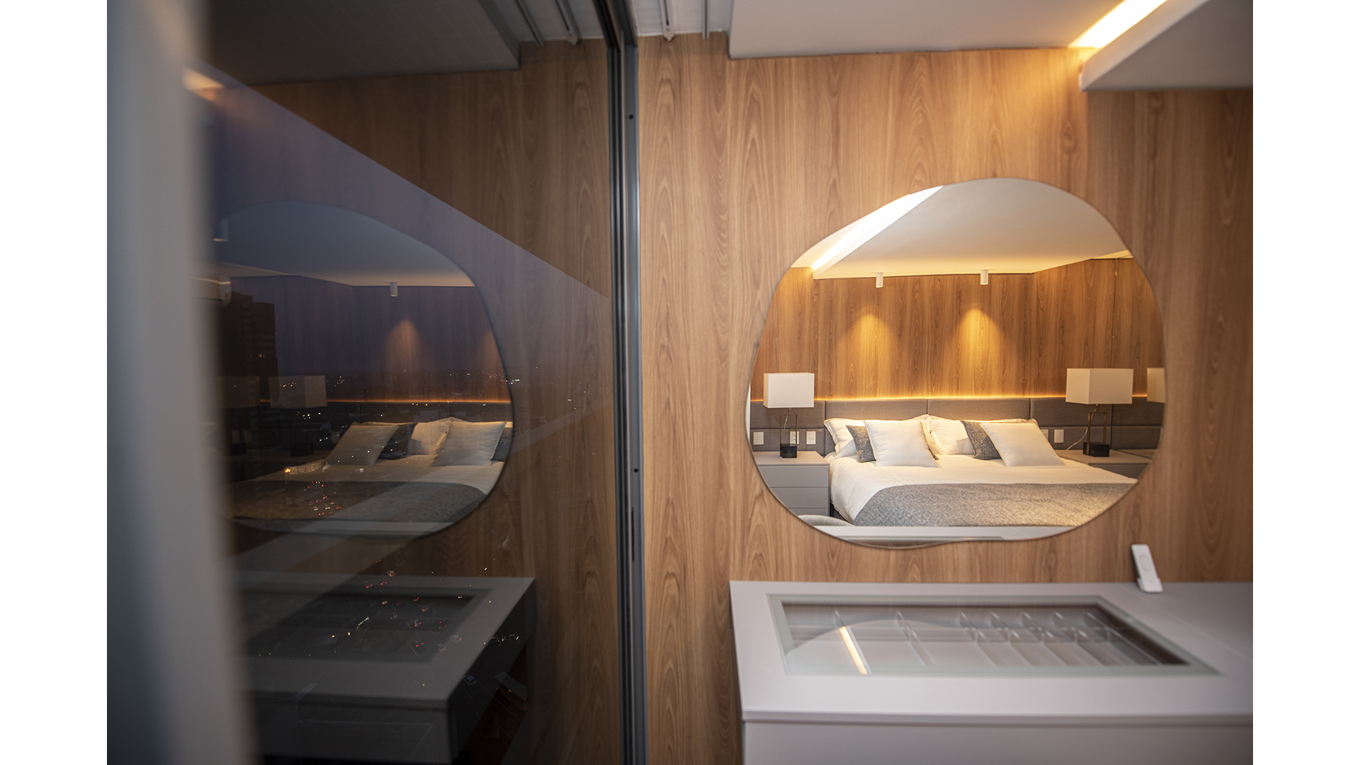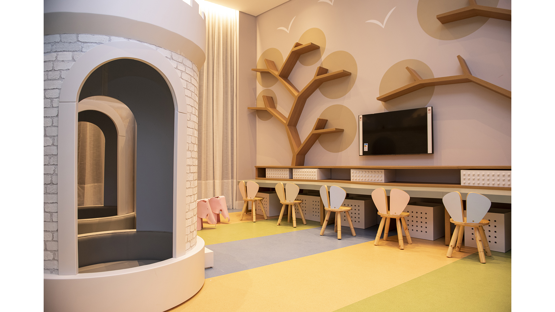 "O hall é uma área social importante para o prédio, e quisemos trazer a sensação de estar em uma galeria de arte. Por isso o pé-direito duplo, uma iluminação quase cênica e as obras de arte", explica o arquiteto Jayme Bernardo. Os espaços compartilhados no térreo possuem acessos individualizados, mas podem ser integrados a partir de portas duplas. A brinquedoteca pode ser integrada à área externa, onde fica o playground, e também ao salão de festas. O salão de festas, por sua vez, pode integrar-se à cozinha gourmet ao abrir o painel ripado de madeira que divide as duas áreas.