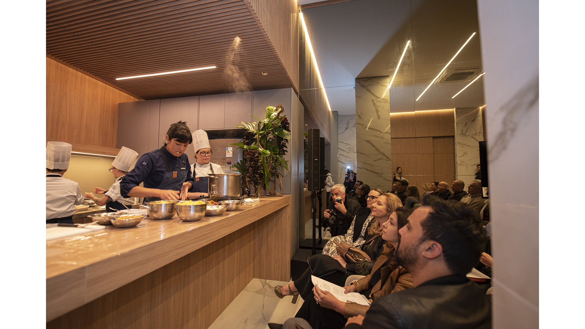 Na noite de 27 de setembro, a Vincere Incorporadora recebeu convidados do mercado imobiliário para apresentar o empreendimento. Arquitetos, designers de interiores, paisagistas e demais profissionais da área foram recebidos com uma aula-show da chef Manu Buffara, do restaurante Manu, na cozinha gourmet do edifício, e seguiram para visitas guiadas às áreas comuns e ao duplex na cobertura, decorado pelo escritório Jayme Bernardo Arquitetos. "É como uma casa no topo da montanha", define Frederico Carstens, arquiteto e sócio da Realiza Arquitetura, responsável pelo projeto arquitetônico do Serra Juvevê.