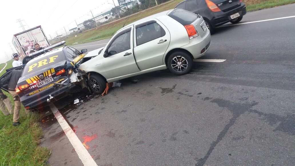 Pouco depois, um carro da PRF que estava em atendimento a esta ocorrência foi atingido por outro carro. De acordo com a PRF, um policial e a condutora do carro que atingiu a viatura ficaram feridos.