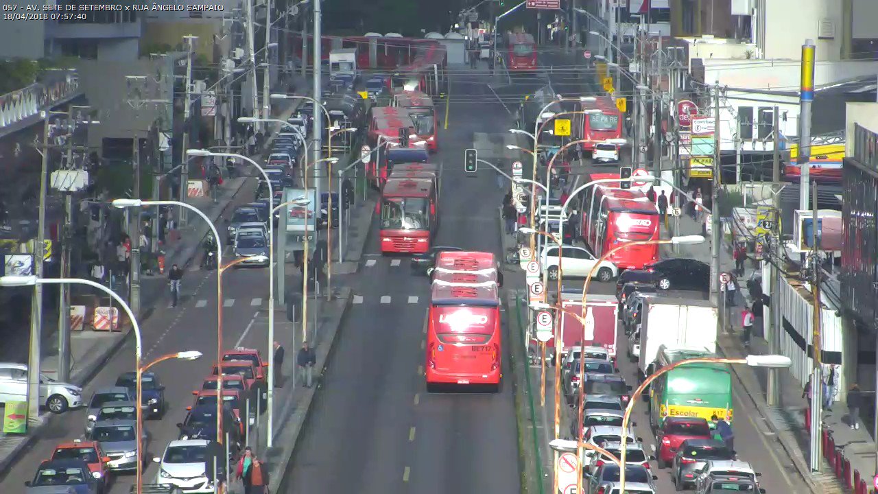 O trânsito ficou confuso na manhã desta quarta-feira (18) nas imediações entre a Avenida Sete de Setembro e a Rua Bento Vianna, no Batel, em Curitiba. No local, um ônibus biarticulado da linha Pinheirinho-Rui Barbosa e uma moto colidiram, bloqueando a passagem dos demais ônibus que passam pela canaleta.