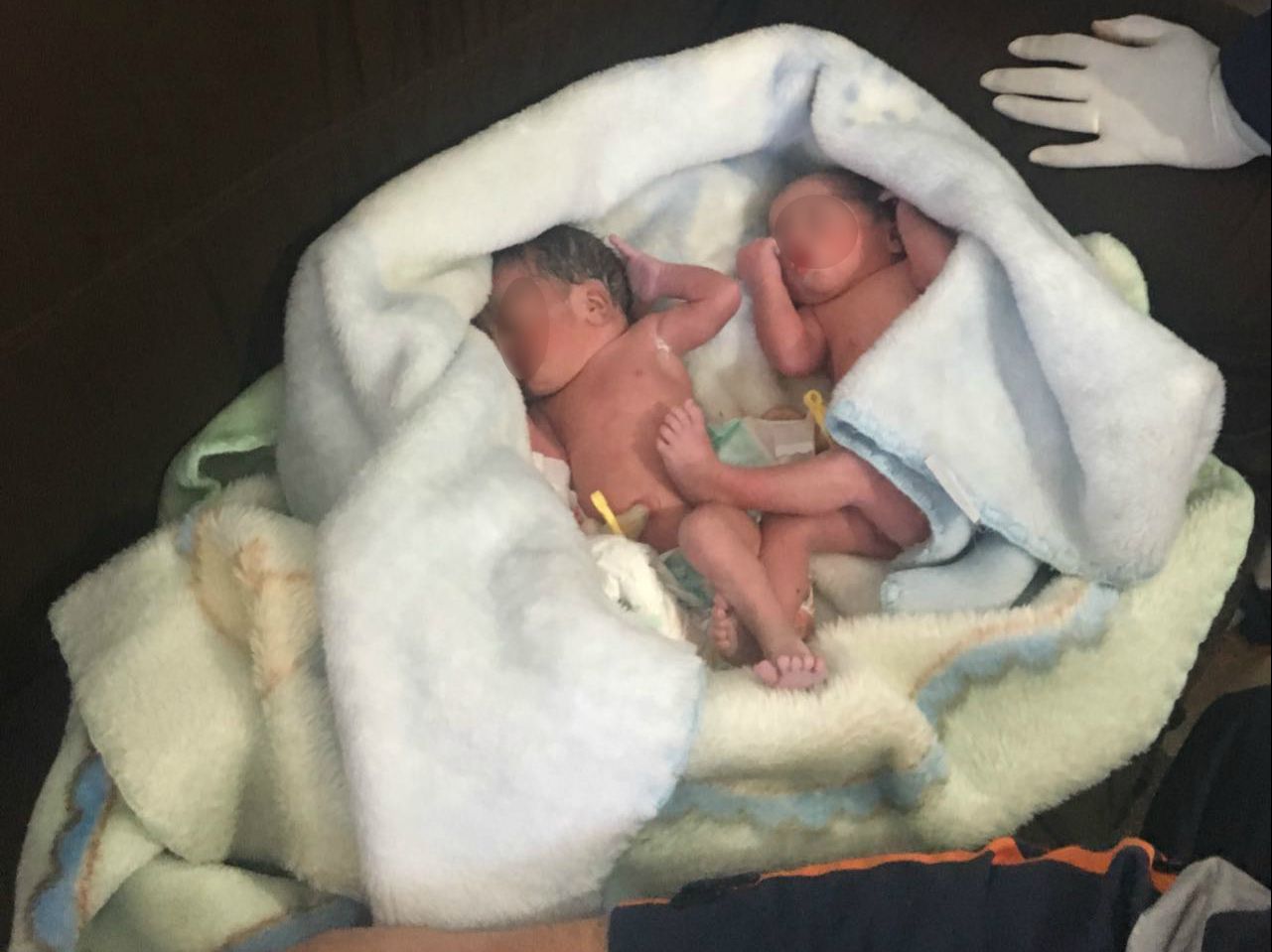 O primeiro atendimento médico prestado às gêmeas foi feito em uma ambulância do Serviço de Atendimento Móvel de Urgência (Samu), ainda perto de onde elas foram achadas. Em seguida, elas foram encaminhadas para uma maternidade da cidade. Segundo a PM, as meninas estão bem.