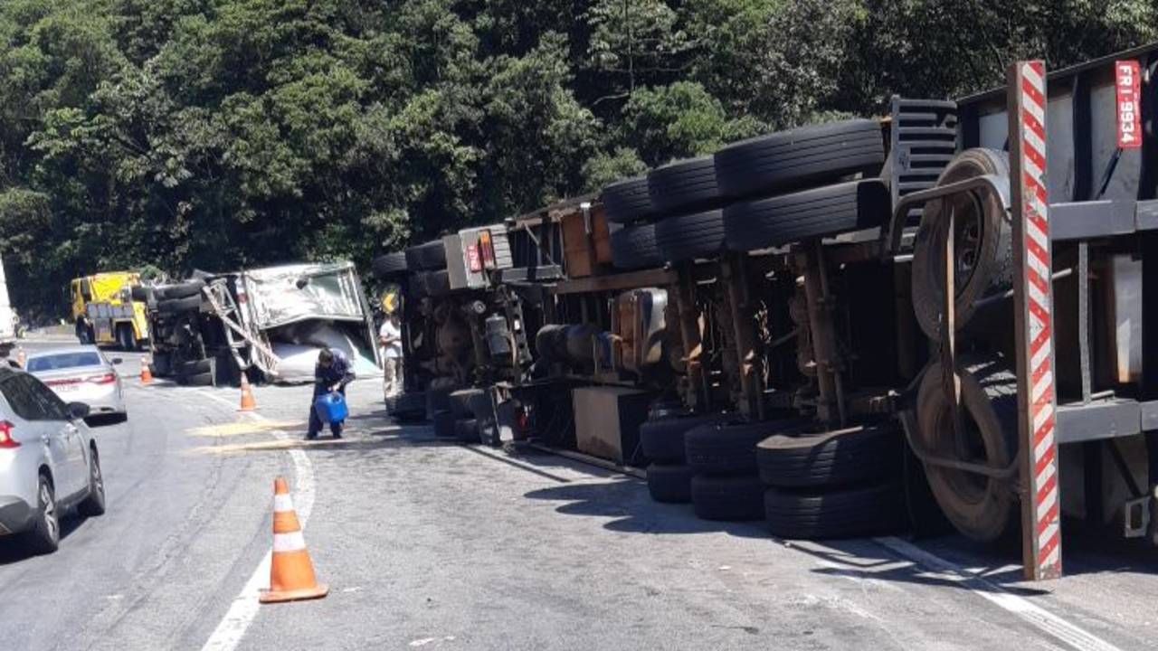 Uma pessoa ficou ferida sem gravidade e foi atendida pela equipe médica da Autopista Litoral Sul, concessionária que administra o trecho. A Polícia Rodoviária Federal (PRF) também atende a ocorrência.