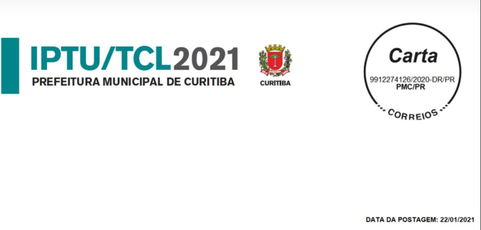 Os carnês para pagamento à vista do IPTU e da Taxa de Coleta do Lixo 2021 de Curitiba começam a ser enviados nesta quarta-feira (13). Todos os donos de imóveis devem receber as guias de pagamento até o fim de janeiro. O vencimento para o pagamento à vista do IPTU é 10 de fevereiro, com desconto de 4%.