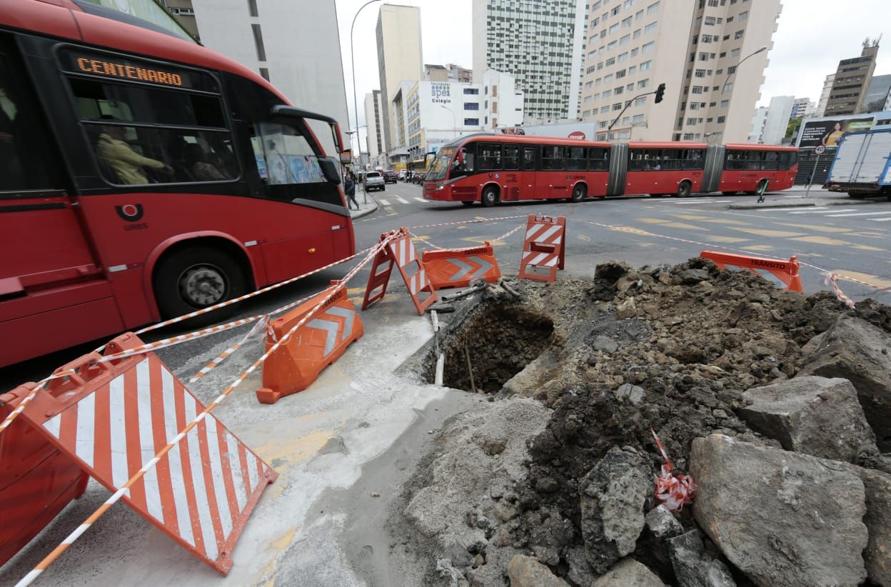 Quem passar pelo cruzamento da Rua Visconde de Nácar com a Rua Cruz Machado, no Centro de Curitiba, pelos próximos vai encontrar um buraco em obra. A cratera, causada por alagamentos constantes na região, está sendo consertada pelo Departamento de Pontes e Drenagens da prefeitura de Curitiba.
