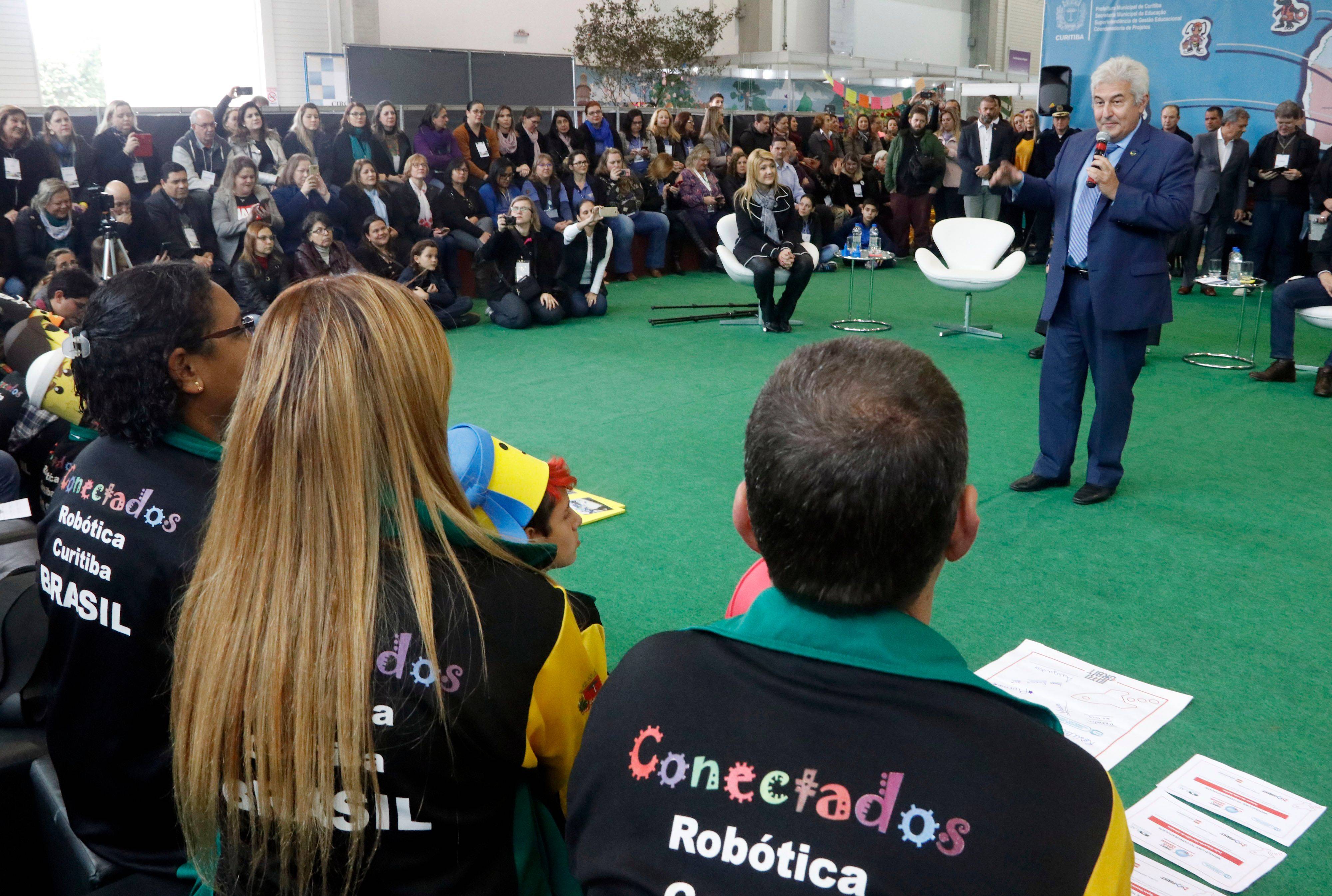 Alunos da equipe de robótica Conectados, da Escola Municipal Coronel Durival Britto e Silva, de Curitiba, ouviram conselhos do astronauta brasileiro e ministro da Ciência, Tecnologia, Inovações e Comunicações, Marcos Pontes do governo de Jair Bolsonaro, na Expo Educação 2019, nesta quinta-feira (4).