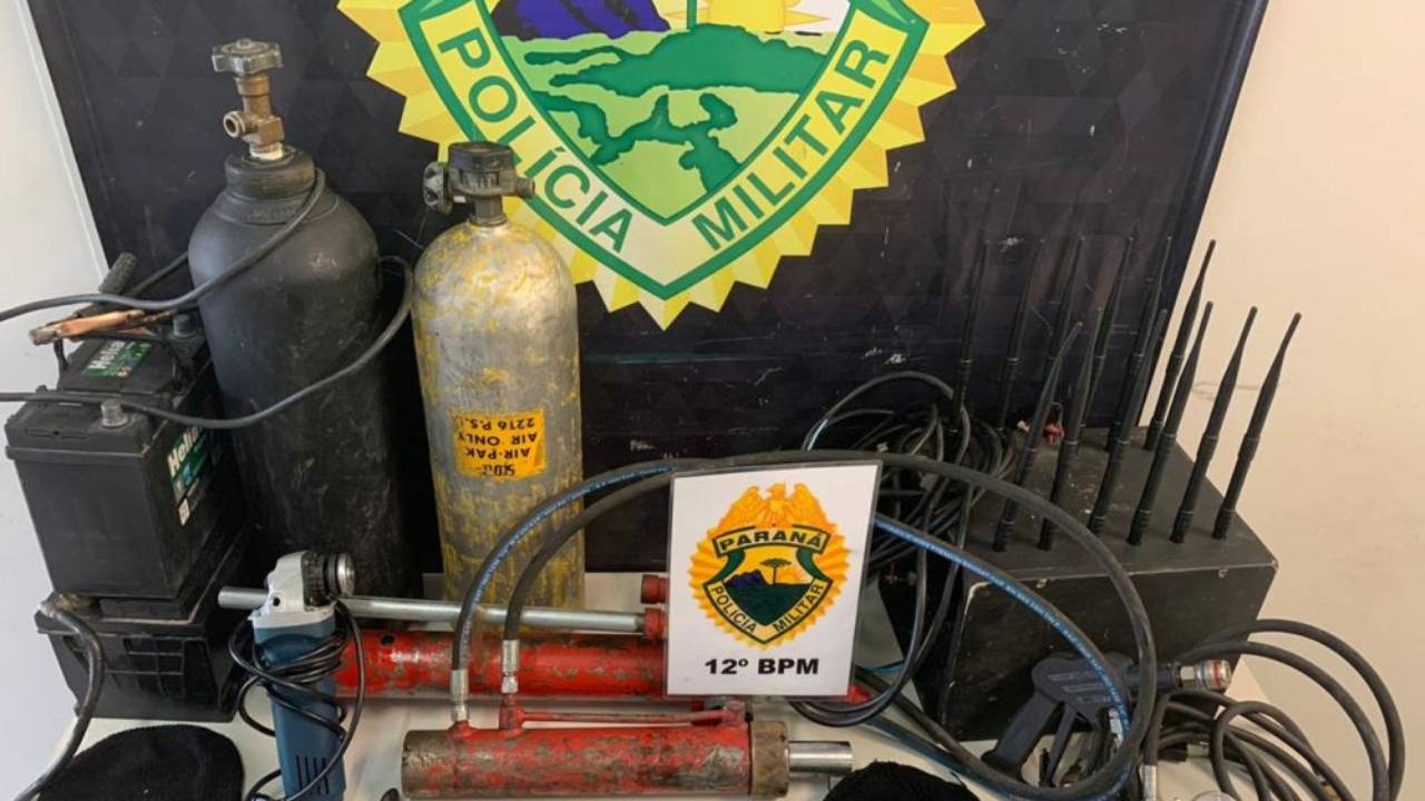 Pé de cabra, macaco hidráulico, maçaricos, equipamento pra cortar o sinal de celulares e até um rádio com a frequência da Polícia Militar (PM). Estes era o equipamento de um grupo de quatro pessoas preso pela PM ao tentar levar R$ 300 mil de um caixa eletrônico em um supermercado do bairro Santa Felicidade, em Curitiba, na madrugada desta sexta-feira (18).