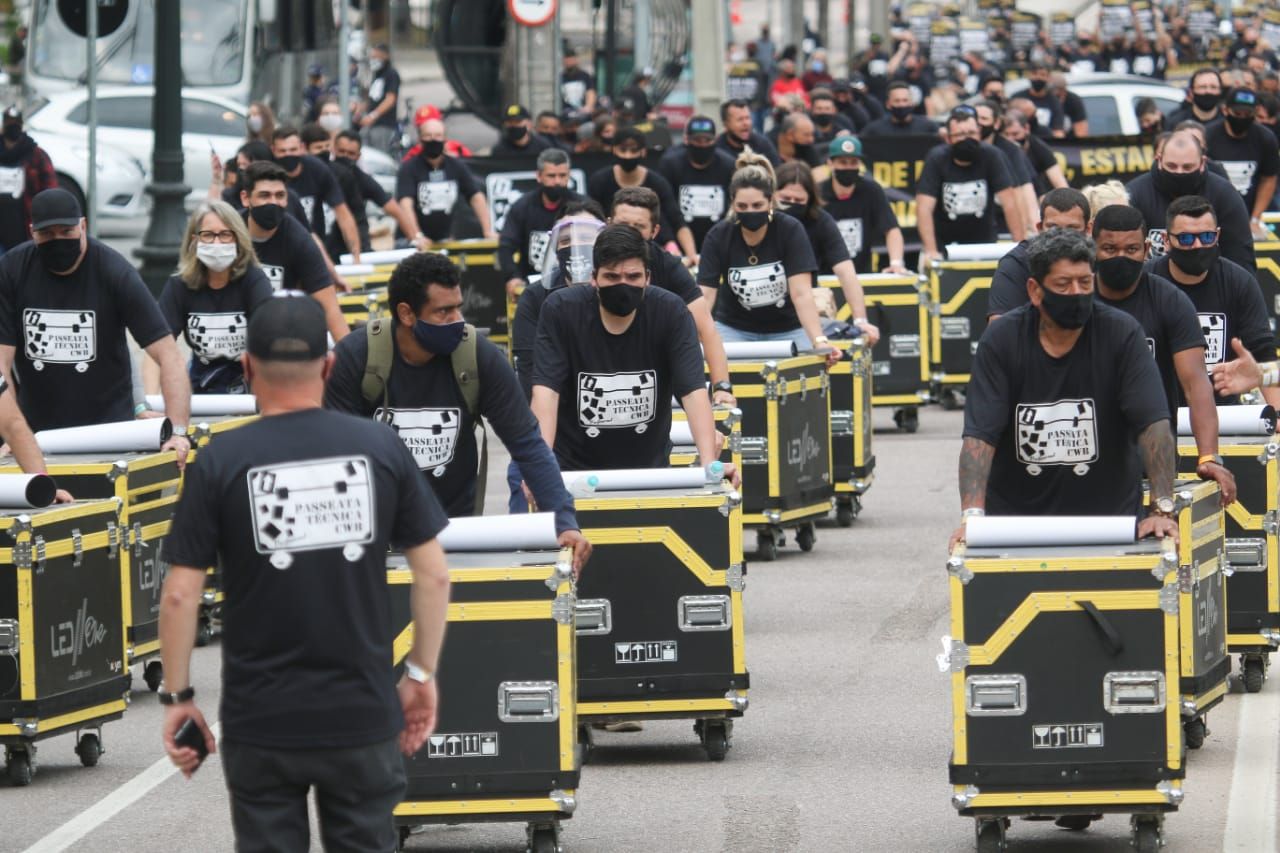Carregando "cases" de equipamentos, muito utilizados no transporte e montagem de estruturas para shows musicais e peças teatrais, cerca de 200 profissionais ligados à produção de eventos fizeram um protesto nesta terça-feira (08), no Centro Cívico. “O setor parou totalmente. Estamos há 180 dias sem trabalhar. Fomos os primeiros a parar e seremos os últimos a voltar", afirmou Sandriane Fantinato, uma das organizadoras do ato. Os trabalhadores, que incluem produtores, gerentes operacionais, diretores técnicos, cerimonialistas, técnicos, montadores, promoters, motoristas, entre outros, elaboraram um documento que deve apresentar, segundo os organizadores, a reivindicação do setor por um plano emergencial por parte do poder público. O documento deve ser entregue à Prefeitura de Curitiba nesta quarta-feira (09).