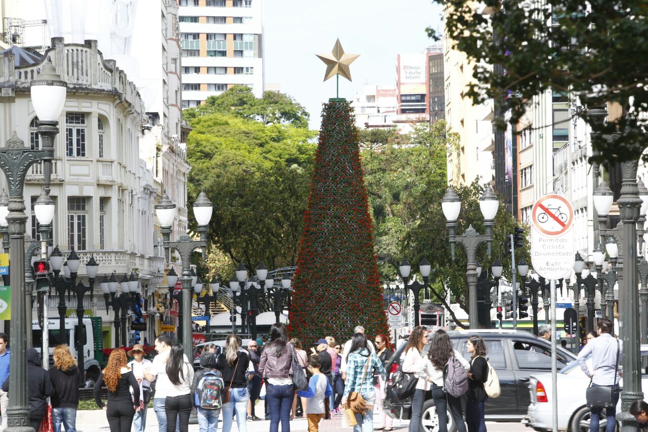 Após cinco anos, o calçadão da Rua XV de Novembro, no Centro de Curitiba, volta a ter decoração de Natal. Uma árvore natalina de 7 metros de altura, formada por vasos com cinco mil flores da espécie sálvia vermelha foi instalada na quadra entre a Alameda Dr. Muricy e a Avenida Mal. Floriano na última segunda-feira (20). O calçadão também ganhou outros elementos decorativos, como estrelas.