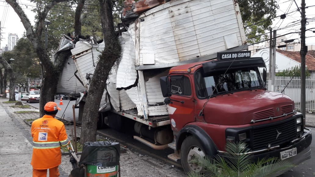 Quem mora ou trabalha na Rua Alferes Ângelo Sampaio, no bairro Água Verde, levou um grande susto no início da tarde desta quinta-feira (14). Por volta das 13h40, um caminhão baú enroscou nos galhos das árvores entre as ruas Brasílio Itiberê e Petit Carneiro, destruindo a carroceria do veículo com o impacto. De acordo com a Copel, os fios de luz da via não foram danificados. No entanto, o desligamento da energia será realizado por segurança e rua está totalmente bloqueada.