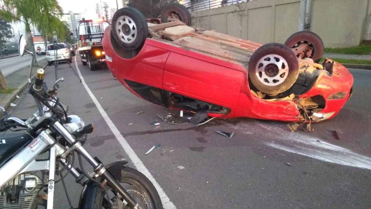 Um carro perdeu o controle, capotou e atingiu duas motos e outros dois carros estacionados na Avenida Presidente Afonso Camargo, nos fundos do Hospital Cajuru, no bairro Jardim Botânico, em Curitiba. O acidente foi por volta de 6h40 e atrapalhou o trânsito na região. Por volta das 7h45 o carro foi retirado da pista.