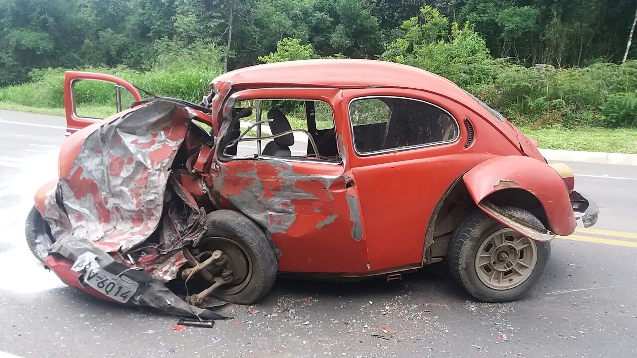 A PRF disse que o acidente ocorreu porque o Fusca não conseguiu fazer uma curva, no km 111 da rodovia, invadiu a pista contrária e bateu de frente em um outro veículo, um Santa Fé.