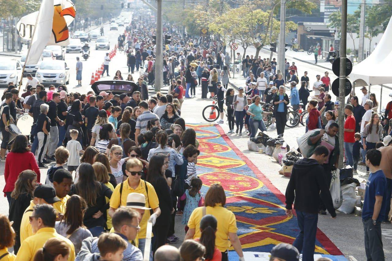 Na capital paranaense, um tapete gigante, feito principalmente com serragem colorida, começou a ser montado logo cedo, estendido no chão da Praça Tiradentes até a Praça Nossa Senhora de Salete, no Centro Cívico.