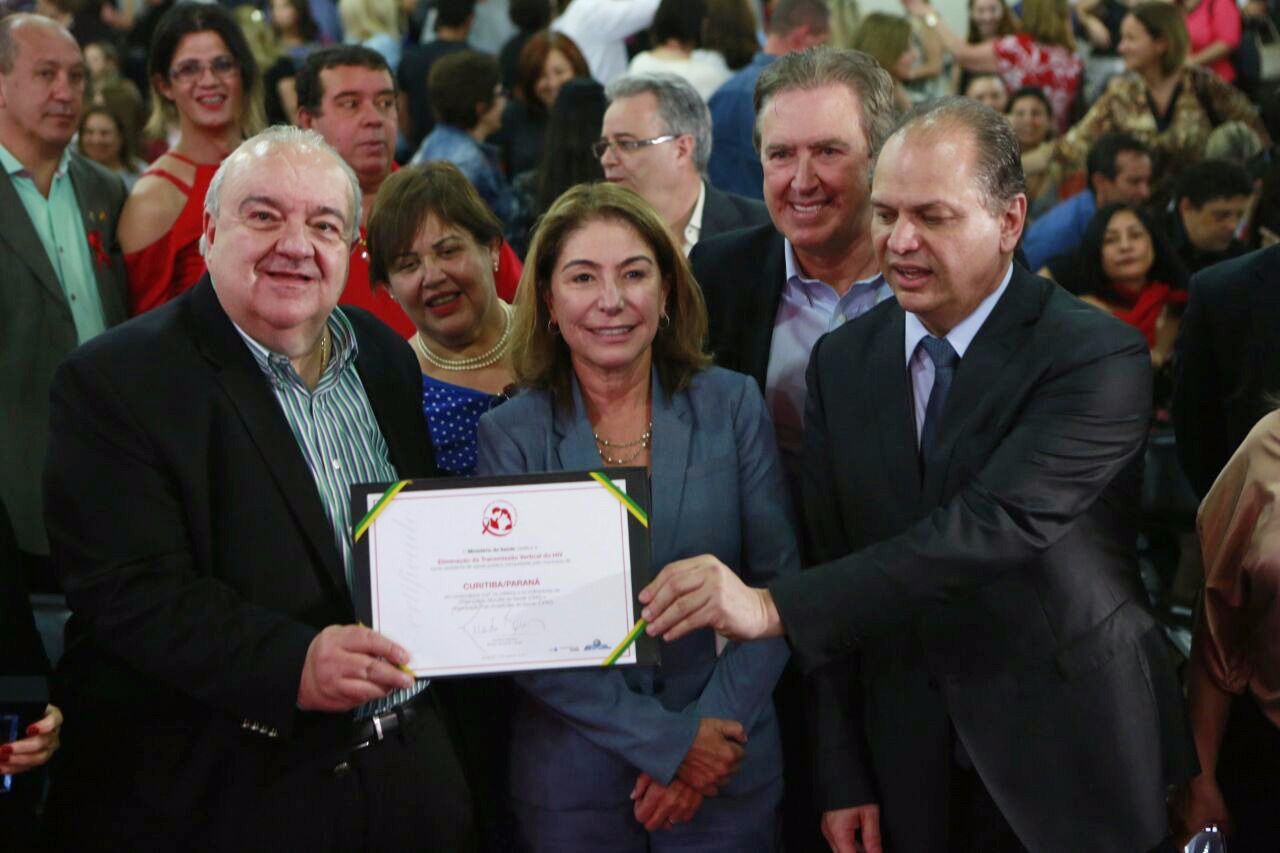 Por causa dessa conquista, o ministro da Saúde, Ricardo Barros, veio a Curitiba para entregar o Certificado de Eliminação da Transmissão Vertical ao prefeito Rafael Greca e à secretária municipal de saúde, Márcia Huçulak. A solenidade ocorreu no Salão de Atos do Parque Barigui nesta sexta-feira.
