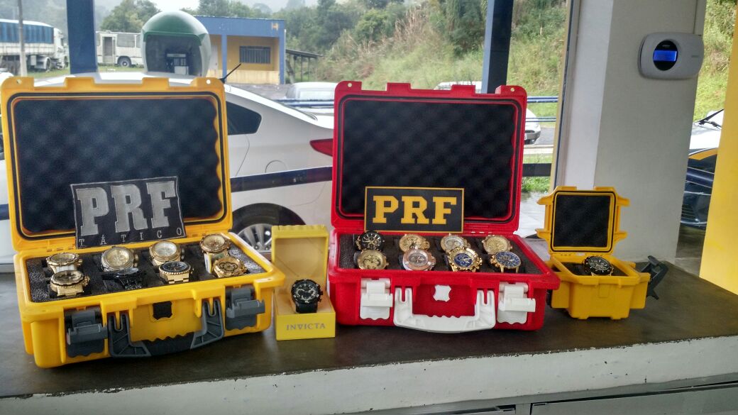 A Polícia Rodoviária Federal (PRF) apreendeu nesta quarta-feira (10), durante uma inspeção de rotina, 18 relógios de luxo em Campina Grande do Sul, na Região Metropolitana de Curitiba ( RMC). Da marca Invicta, os produtos são avaliados em mais de R$ 50 mil e foram trazidos ilegalmente do Paraguai. O custo unitário de cada um dos relógios é de cerca de US$ 1,2 mil, o equivalente a R$ 3,8 mil, conforme a cotação do dólar desta quinta-feira (11).