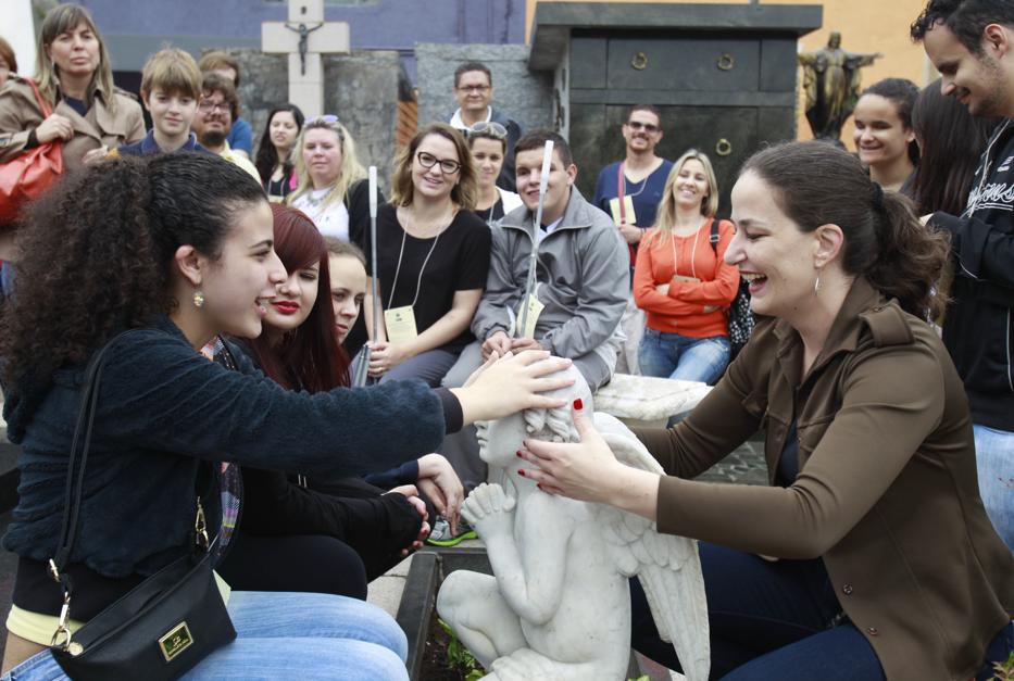 “Aqui temos uma entrada grande e alta, em formato de arco, ela é roxa. No topo temos um mural em que Jesus Cristo está representado de braços abertos. Nos murais ao lado temos a representação de dois anjos do Apocalipse tocando grandes trombetas. Há também nos murais laterais imagens de idosos e famílias, representando as almas que são recebidas no céu”. Essa foi a primeira das inúmeras descrições do Cemitério São Francisco de Paula, o Cemitério Municipal de Curitiba, feitas pela historiadora e pesquisadora Clarissa Grassi na manhã do último sábado (17). O motivo da fala detalhada era dos mais nobres: sete alunos do Instituto Paranaense de Cegos (IPC) e do Projeto Ver com as Mãos faziam parte do grupo de 47 pessoas que participaram da já tradicional visita guiada ao cemitério.