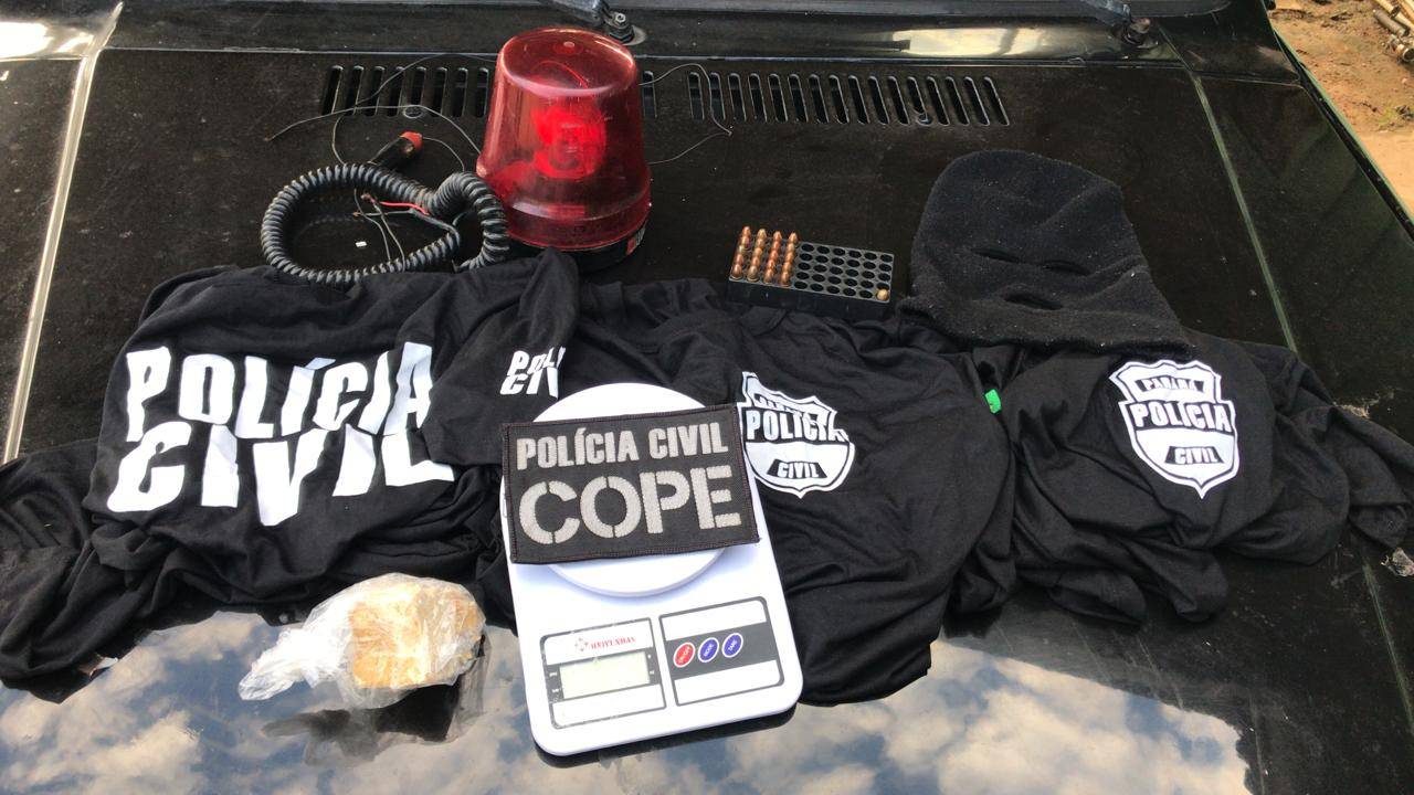 Junto com o trio, foram apreendidos adereços de uso exclusivo da Polícia Civil, como roupas com a marca da corporação. Um dos materiais tinha a identificação do Centro de Operações Policiais Especiais (Cope), grupo de investigação de elite da Polícia Civil, que apura casos como roubos a bancos e fuga de presídios.
