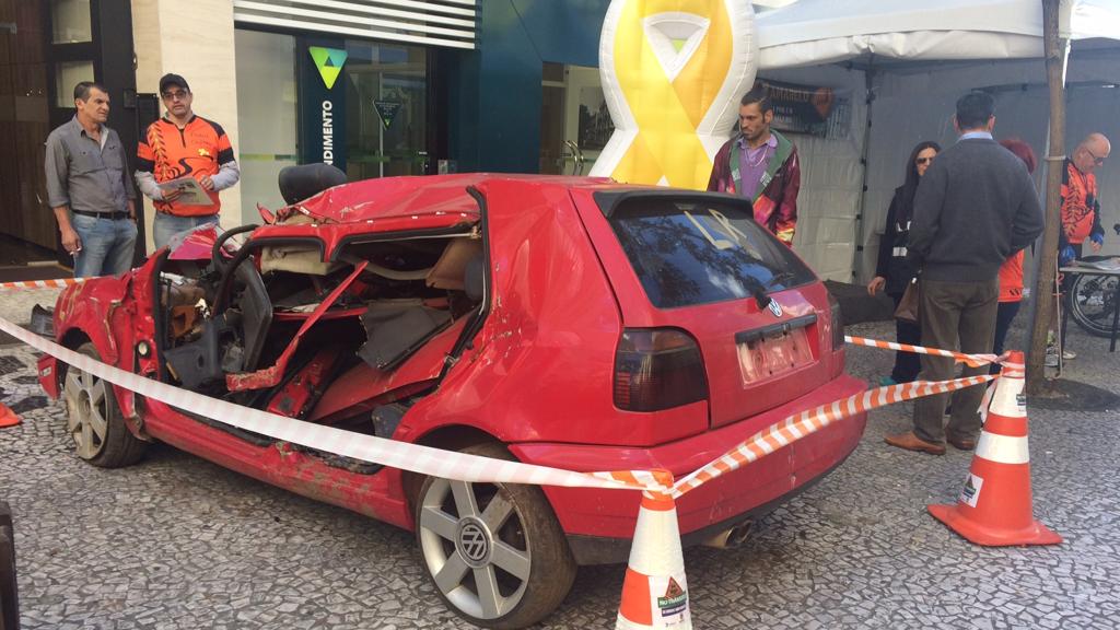 Um Golf vermelho totalmente destruído chama a atenção de quem passa pelo calçadão da Rua XV de Novembro, no Centro de Curitiba, nesta segunda-feira (8). A exposição do carro – que sofreu perda total – faz parte de uma ação de conscientização do Maio Amarelo 2017, um movimento mundial pela redução de mortes no trânsito.