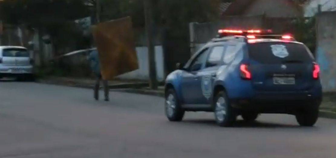 Uma cena inusitada registrada na tarde de quarta-feira (22) em Fazenda Rio Grande, na Região Metropolitana de Curitiba, vem ganhando fama nas redes sociais. As imagens, compartilhadas no Facebook, mostram uma viatura da Guarda Municipal (GM) da cidade "escoltando" um homem que carrega a cobertura de um ponto de ônibus. Mas ao contrário do que foi divulgado, não se tratou de um crime e o "escoltado" não foi preso.