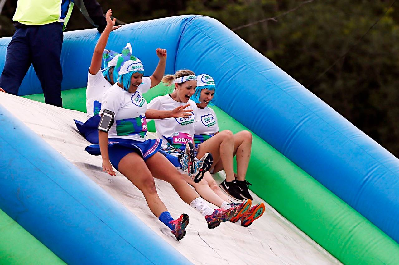 Largada Insana: A prova começa com o desafio de uma subida, seguida por um escorregador gigante.