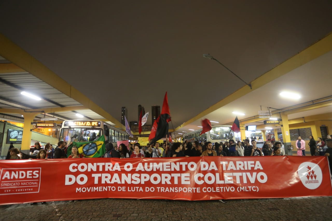 Após o anúncio do aumento da tarifa do transporte público de Curitiba, um grupo de cerca de 300 manifestantes se reuniu, nesta terça-feira (26), em protesto contra o reajuste. Os participantes se encontraram por volta das 17h30 na Praça Rui Barbosa, e no início da noite caminharam por ruas do Centro em direção ao terminal Guadalupe. Entre as reivindicações, está a revisão da licitação do transporte da capital.