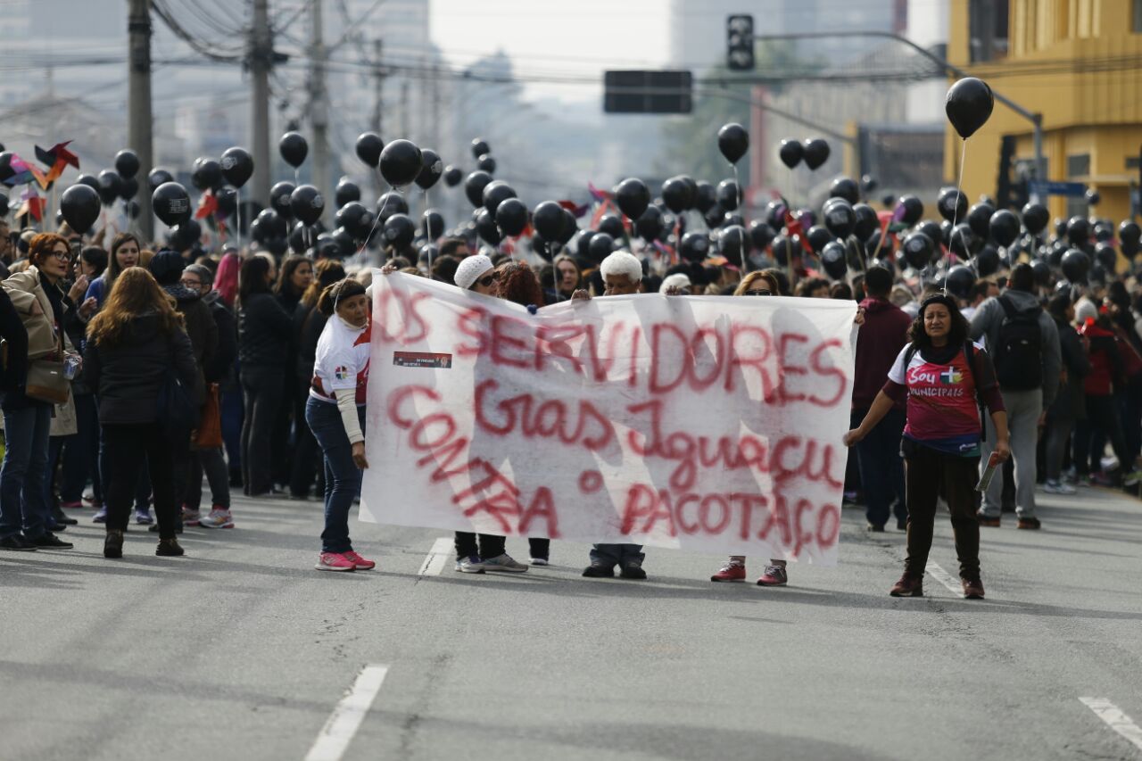 Professores da rede municipal de ensino de Curitiba que decidiram fazer greve nesta segunda-feira (12) por causa da votação do projeto de ajuste fiscal proposto pela prefeitura foram para as ruas para tentar mobilizar colegas que começaram a semana em sala de aula. Segundo os servidores, a possibilidade de desconto dos dias parados no salário - o que já se concretizou em greves anteriores - pode ter sido um dos motivos para que docentes ignorassem a paralisação, reforçada por outras classes. Na manhã desta segunda, centenas de trabalhadores se concentram em frente à Câmara de Vereadores como forma de protestar contra o Pacotaço. Eles chegaram a bloquear o trânsito por algumas horas.