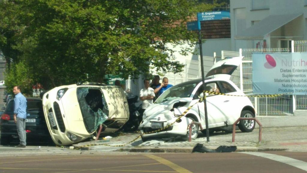 Um grave acidente aconteceu no começo da tarde desta terça-feira (19), no bairro Rebouças, em Curitiba. Um veículo Fiat 500 seguia pela Rua Engenheiros Rebouças quando foi atingido por um Ka, que descia a Rua Lamenha Lins.